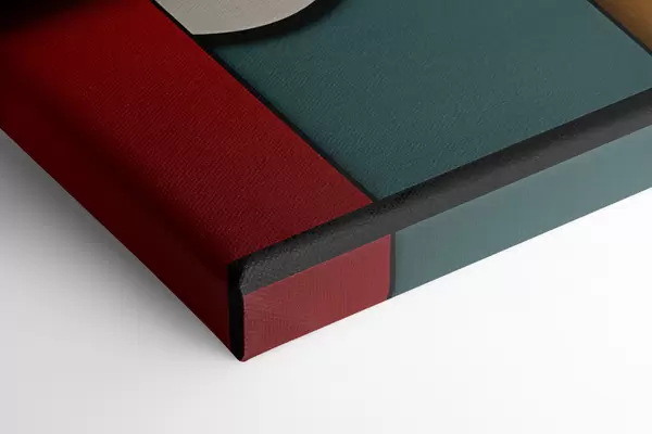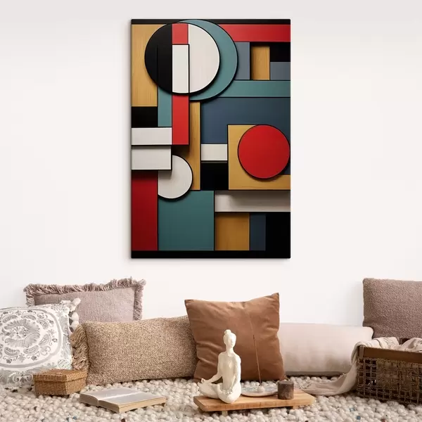 Obraz Abstraktná geometrická kompozícia s imitáciou drevenej textúry, červenými, čiernymi, bielymi a tyrkysovými obdĺžnikmi a kruhmi Nr. s47875