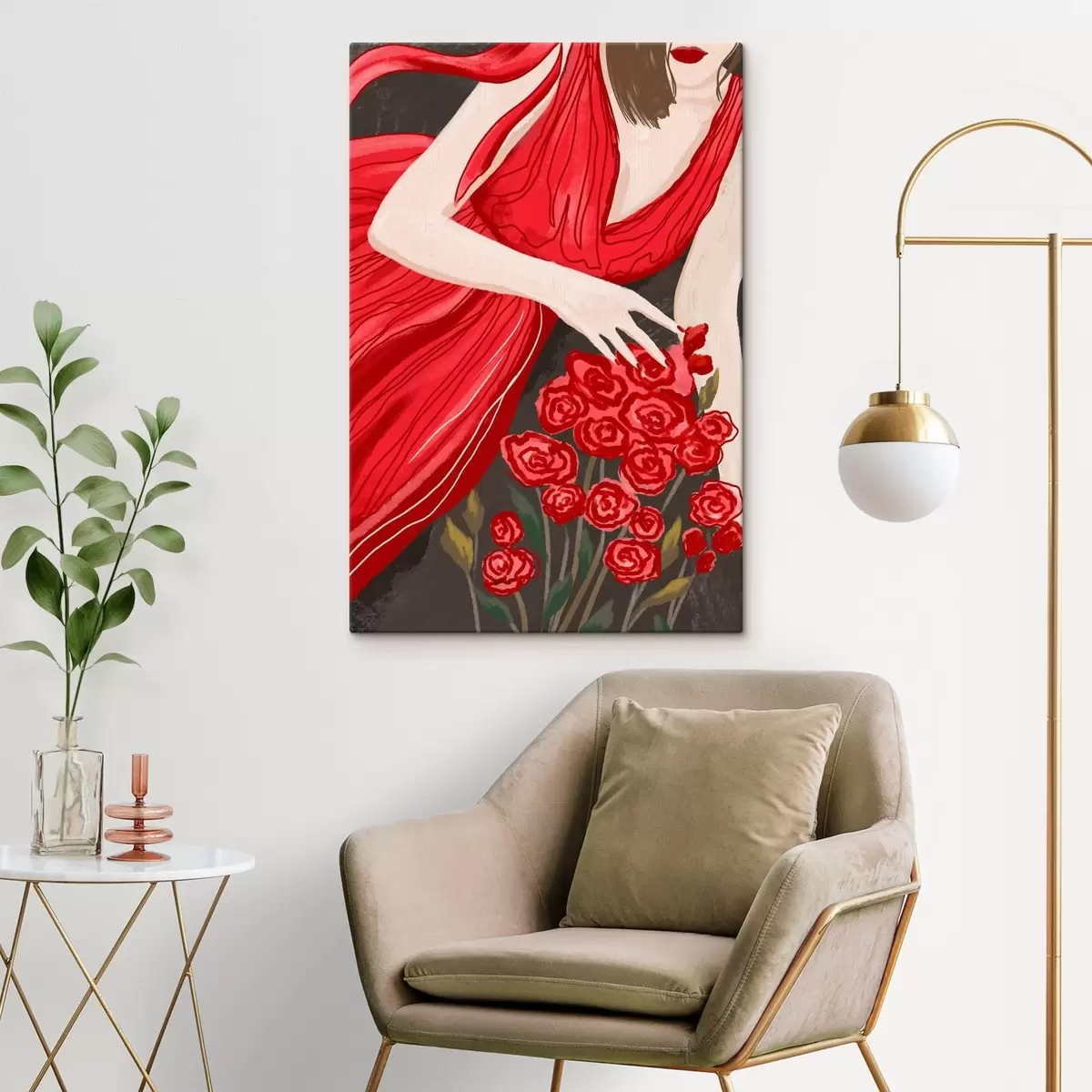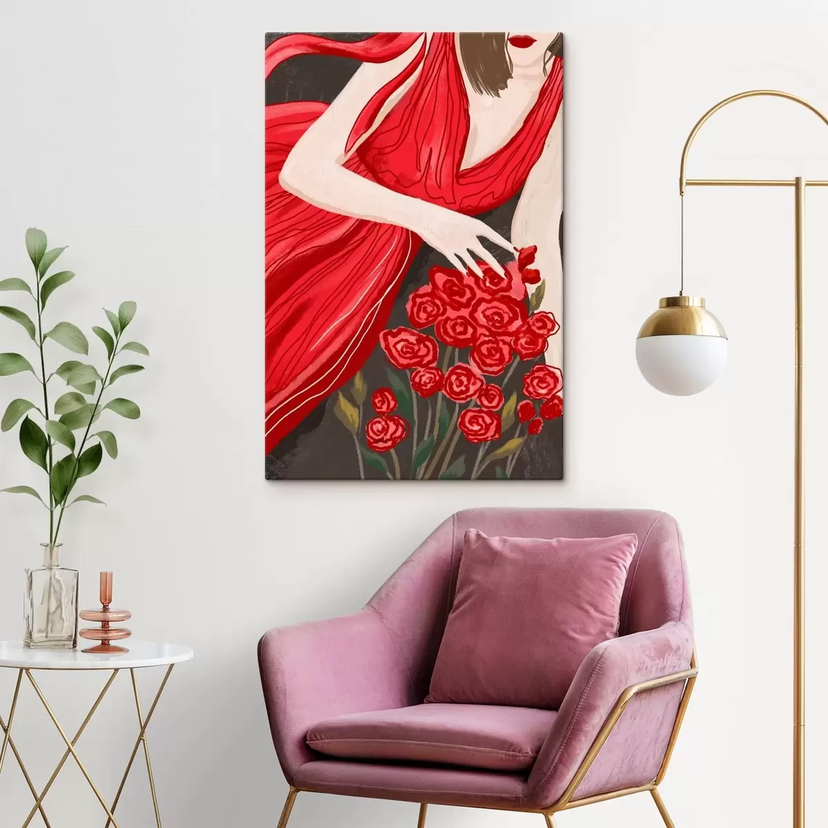 Obraz Žena v červených šatách s kyticou ruží Nr. s48026