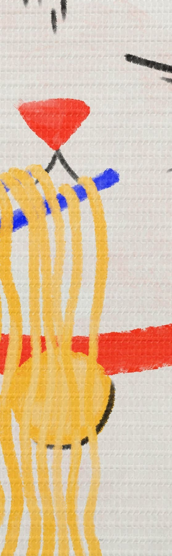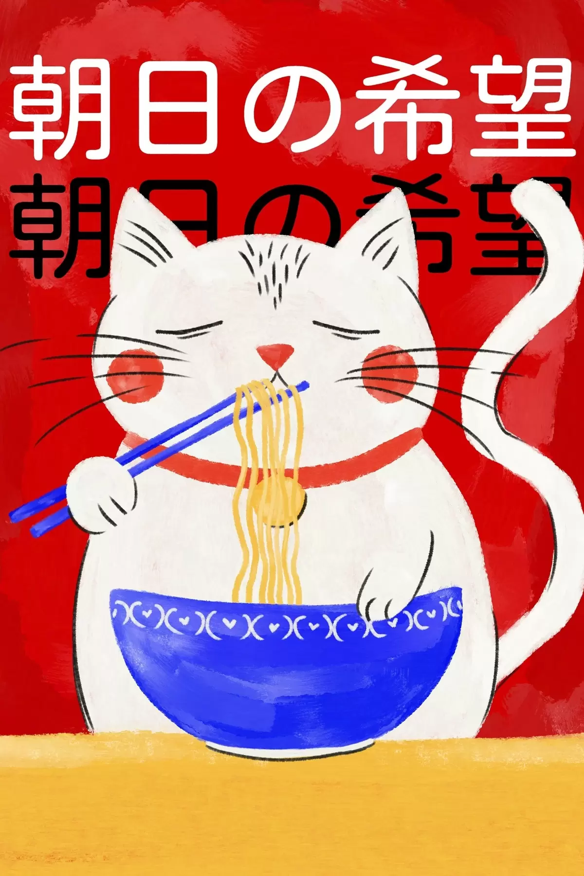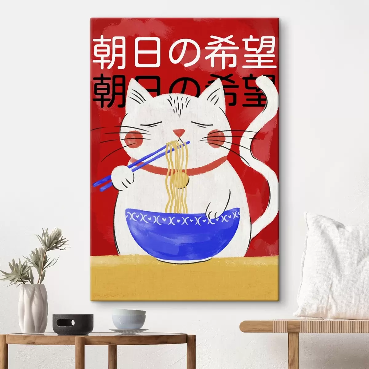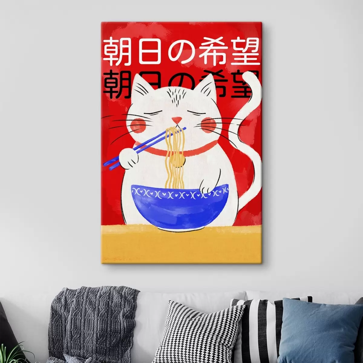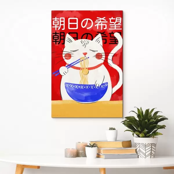 Obraz Ilustrácia mačky jediacej rezance na červenom pozadí Nr. s48031