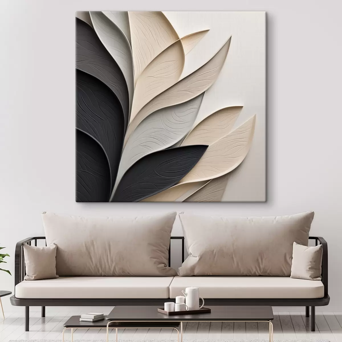 Obraz Abstraktná kompozícia z vrstvených listov, zakrivených tvarov v čiernej, bielej a béžovej farbe, textúrované umenie Nr. s48382