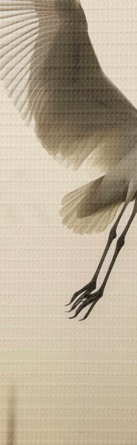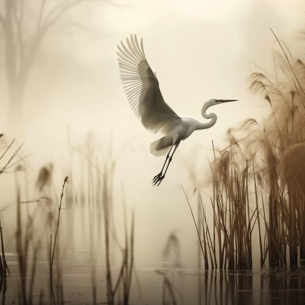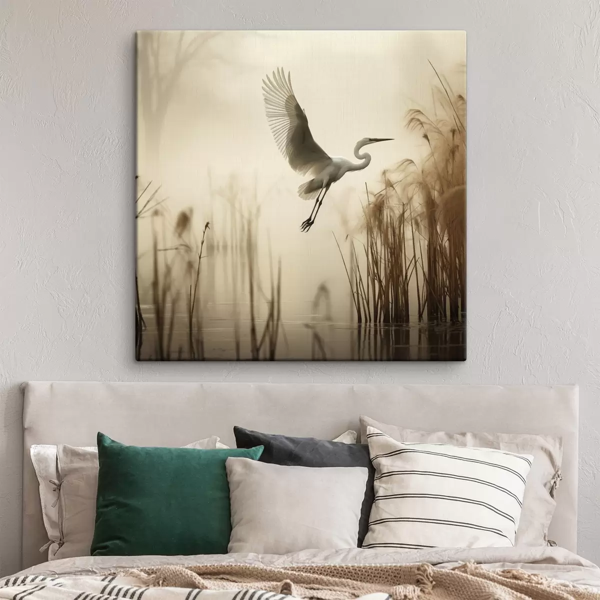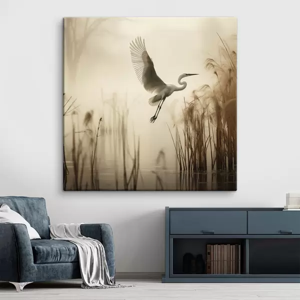 Obraz Nad jazerom lieta biela volavka, v pozadí ju obklopujú vysoké trstiny a stromy Nr. s48389