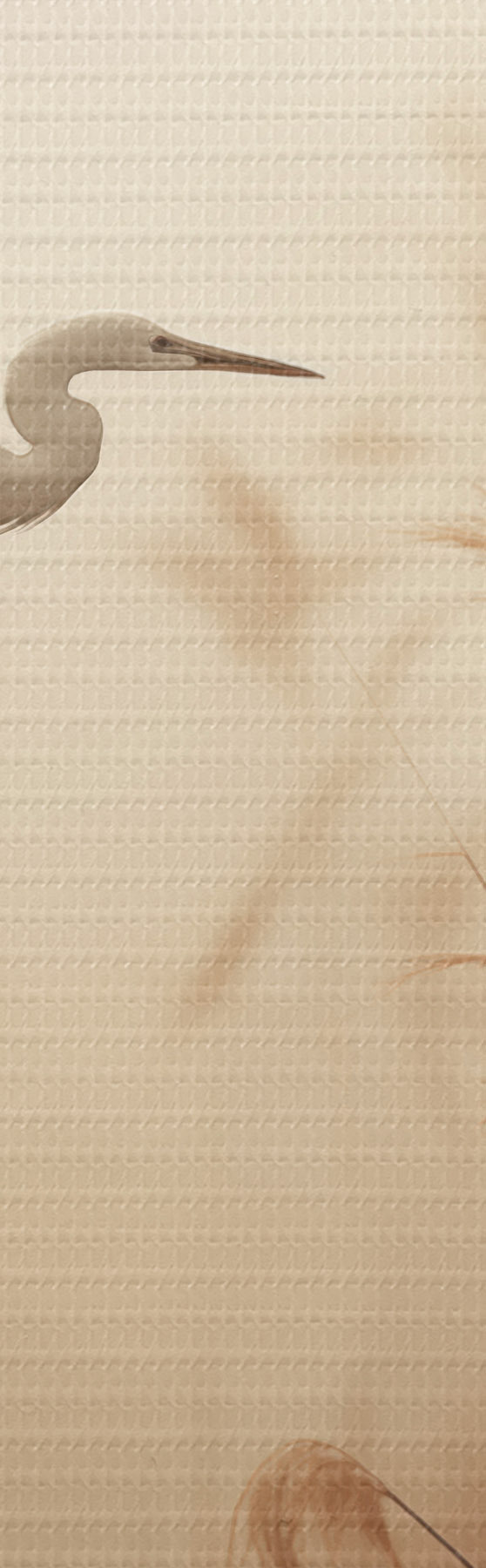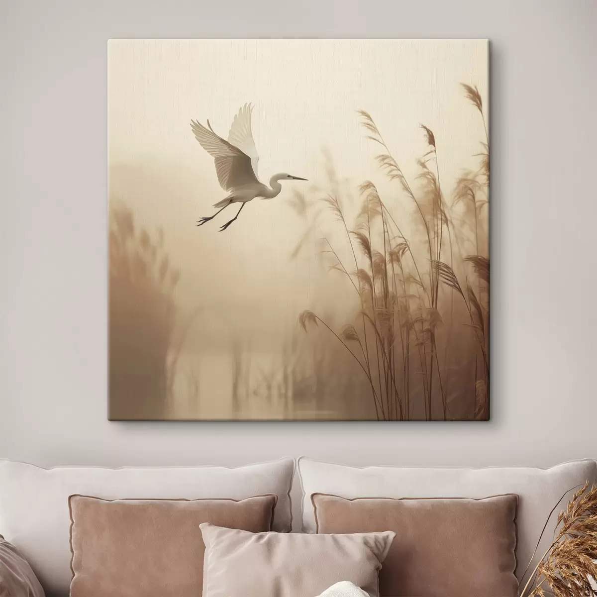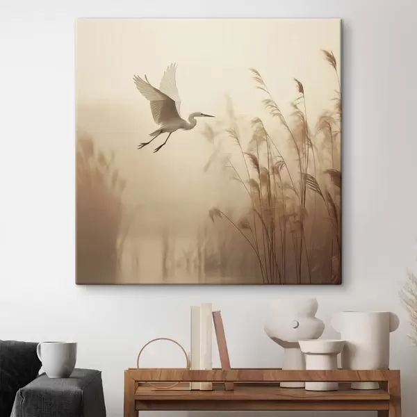 Obraz Nad jazerom lieta biela volavka, v pozadí ju obklopujú vysoké trstiny a stromy Nr. s48390