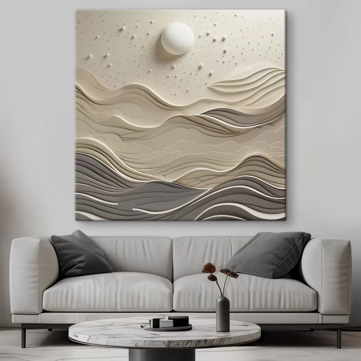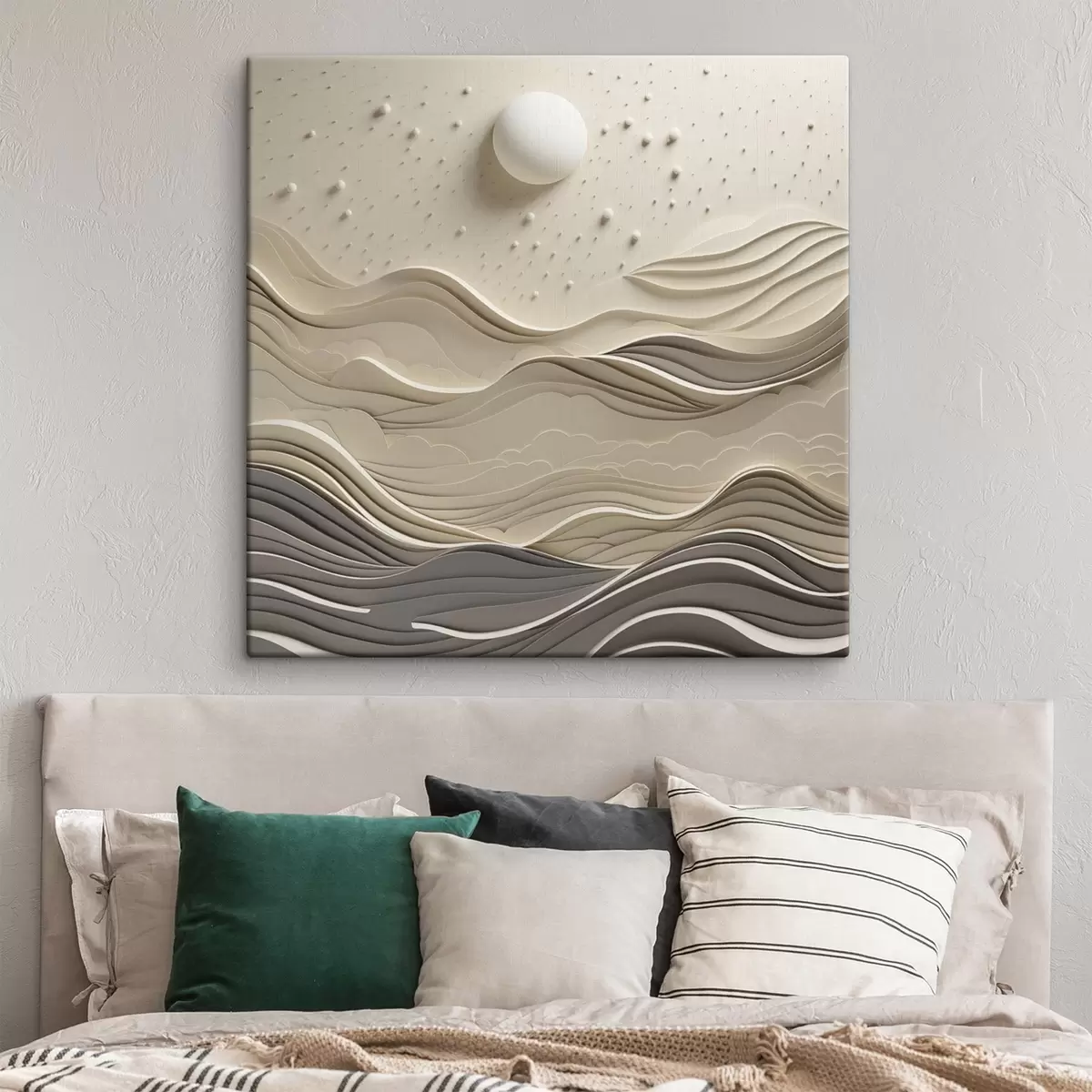 Obraz Minimalistická štýlová krajina s vlniacimi sa kopcami a veľkým mesiacom na hviezdnej oblohe, abstraktné umenie Nr. s48402