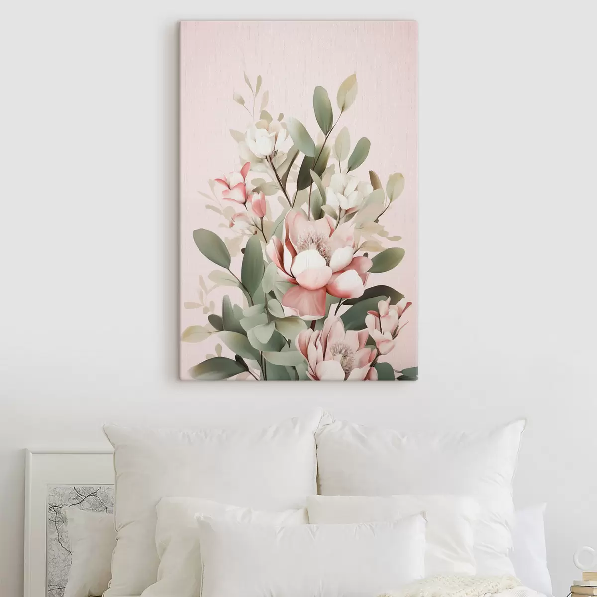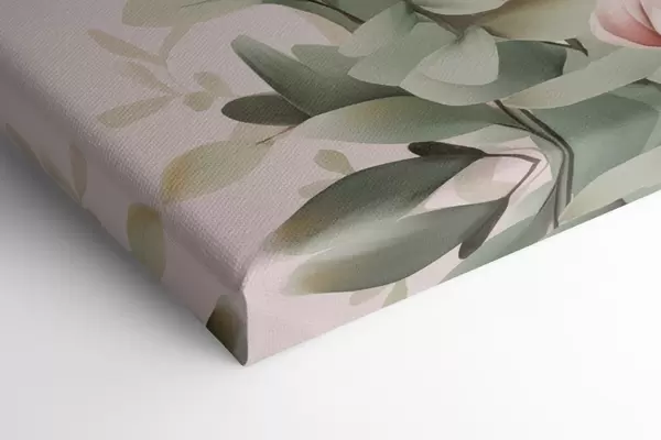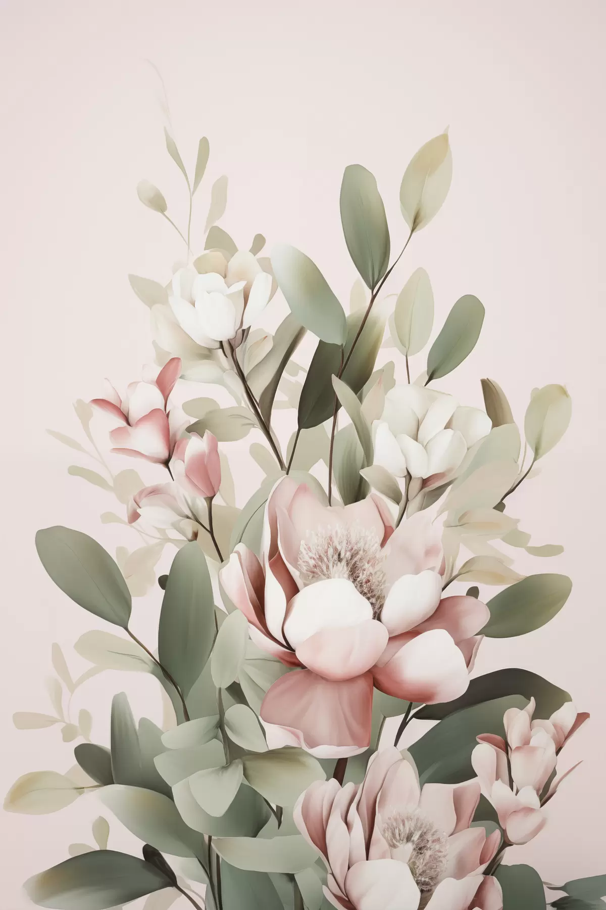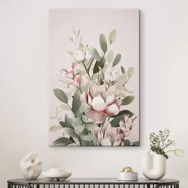 Obraz Kytica pastelových kvetov s listami eukalyptu na bledoružovom pozadí Nr. s48727