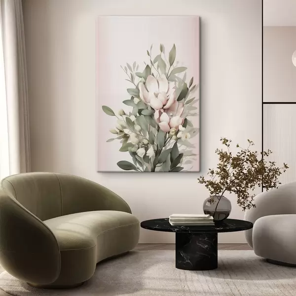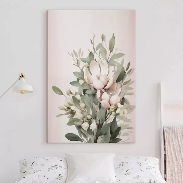 Obraz Kytica pastelových kvetov s listami eukalyptu na bledoružovom pozadí Nr. s48728