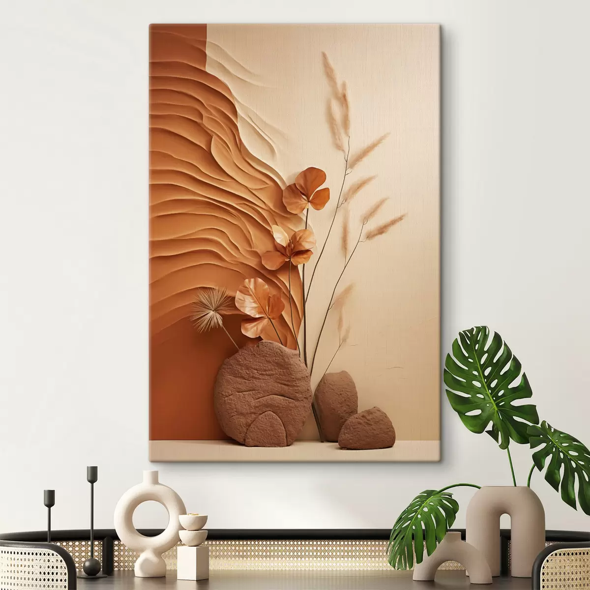 Obraz Minimalistické umelecké dielo so sušenými kvetmi a pampovou trávou, s textúrovaným pozadím Nr. s48739