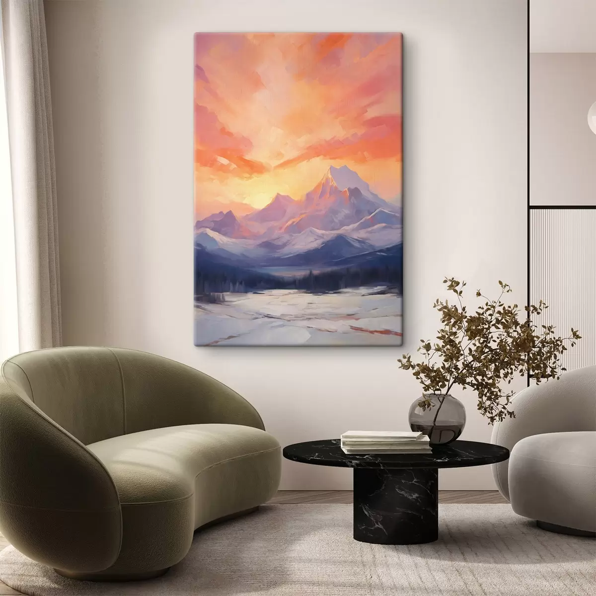 Obraz Zasnežené vrchy pod žiarivo oranžovou a ružovou oblohou s mrakmi Nr. s48741