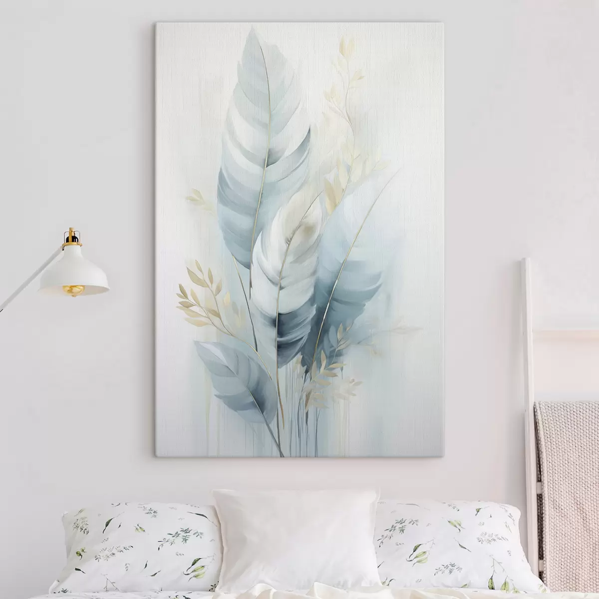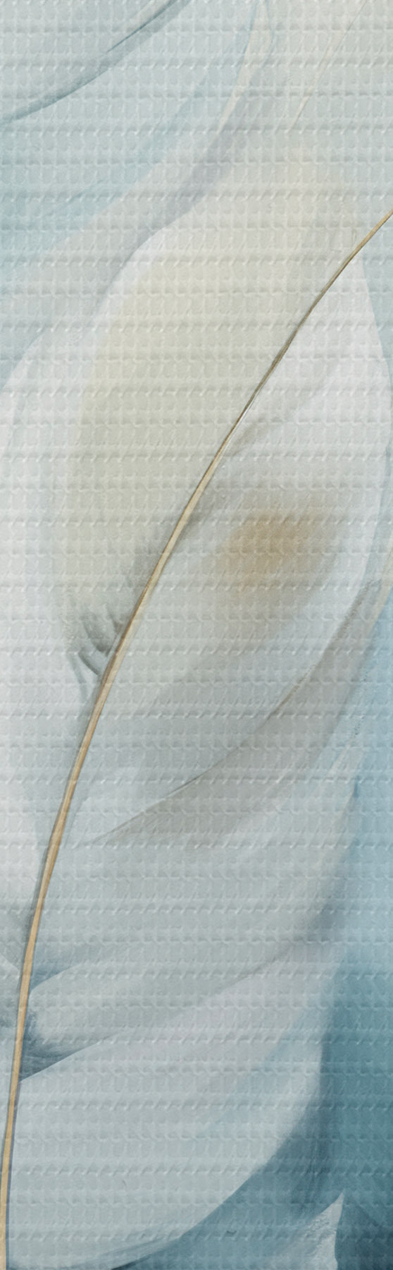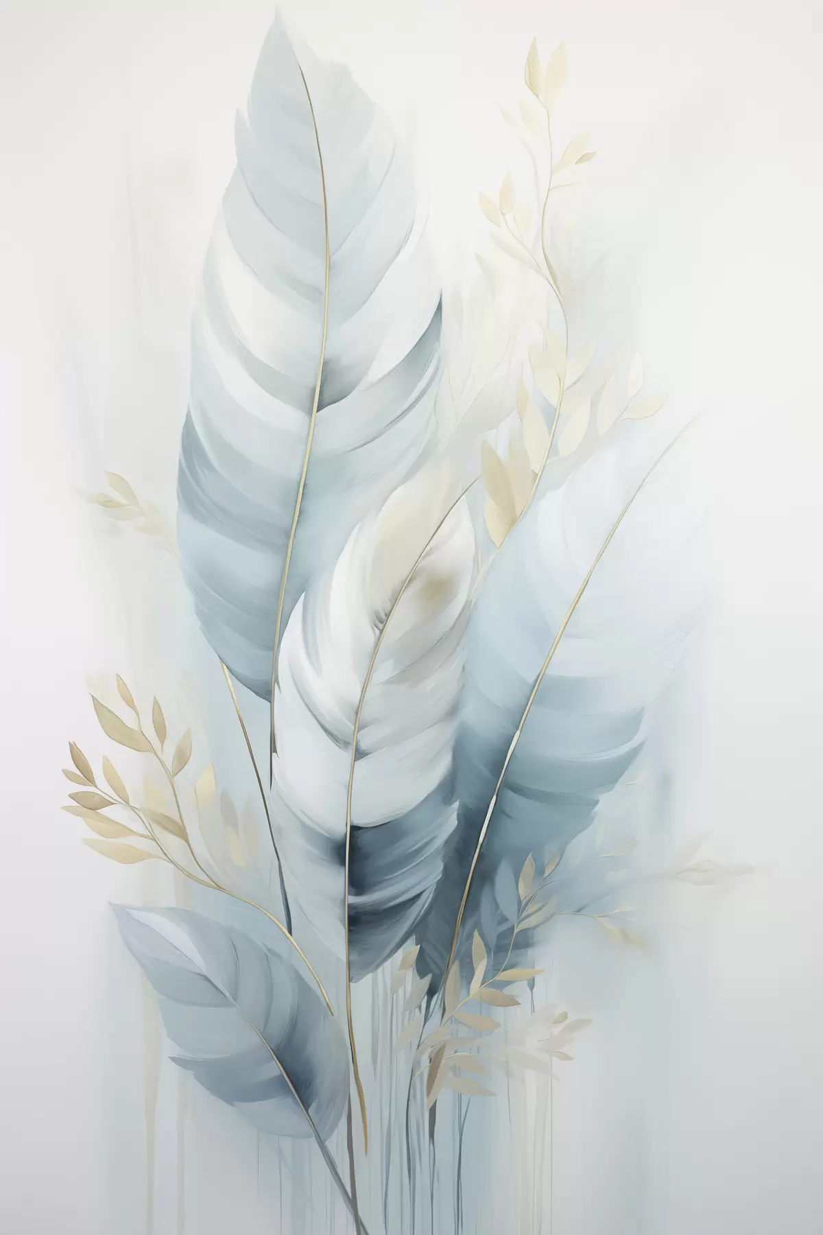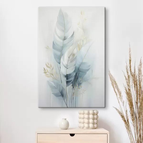 Obraz Veľké, mäkké pierka v odtieňoch modrej a bielej s jemnými béžovými lístkami Nr. s48749