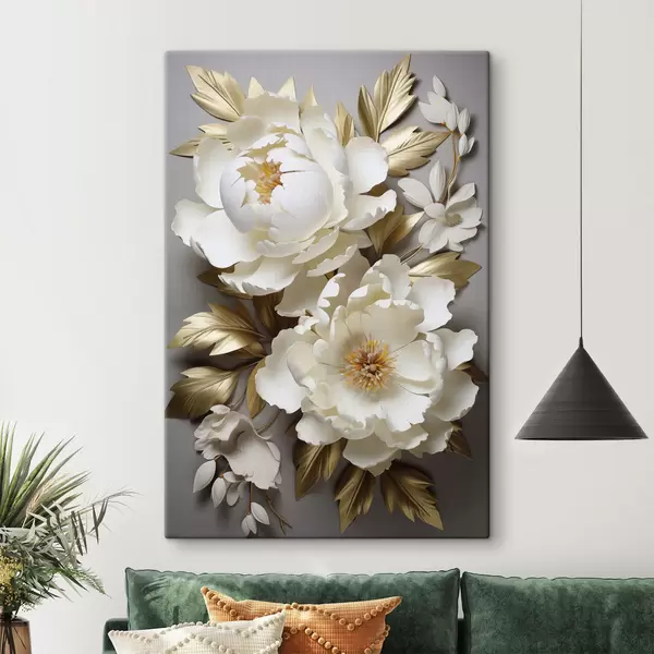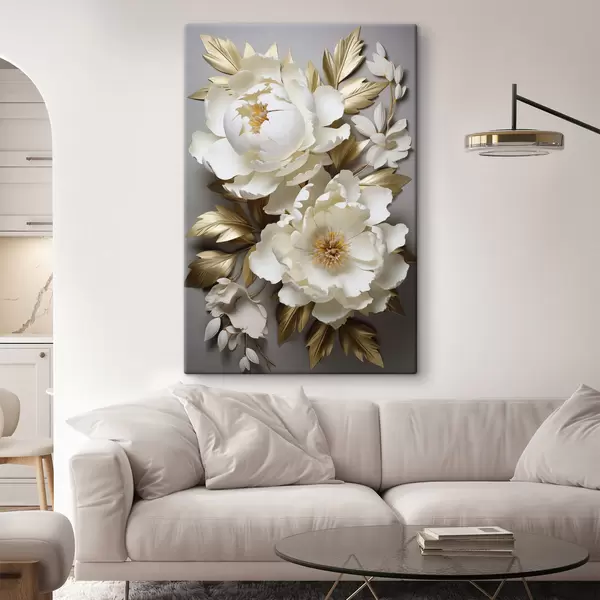Obraz Veľké biele pivonky so žltými listami na sivom pozadí Nr. s48753