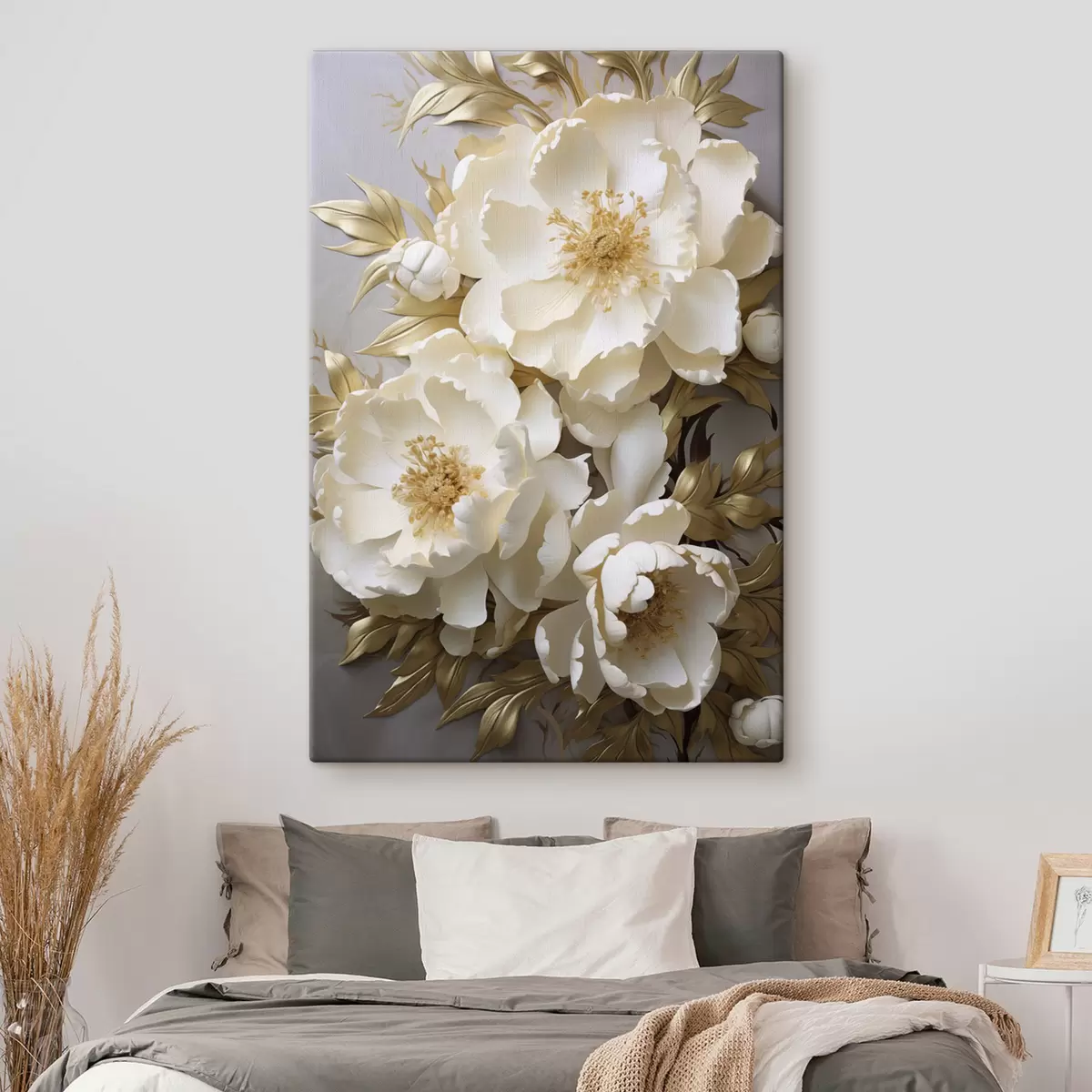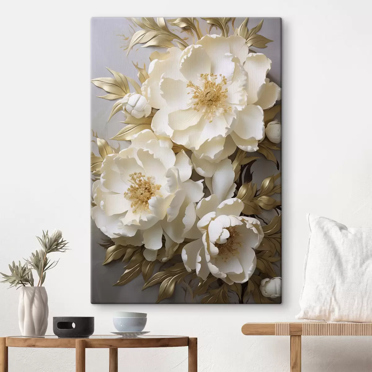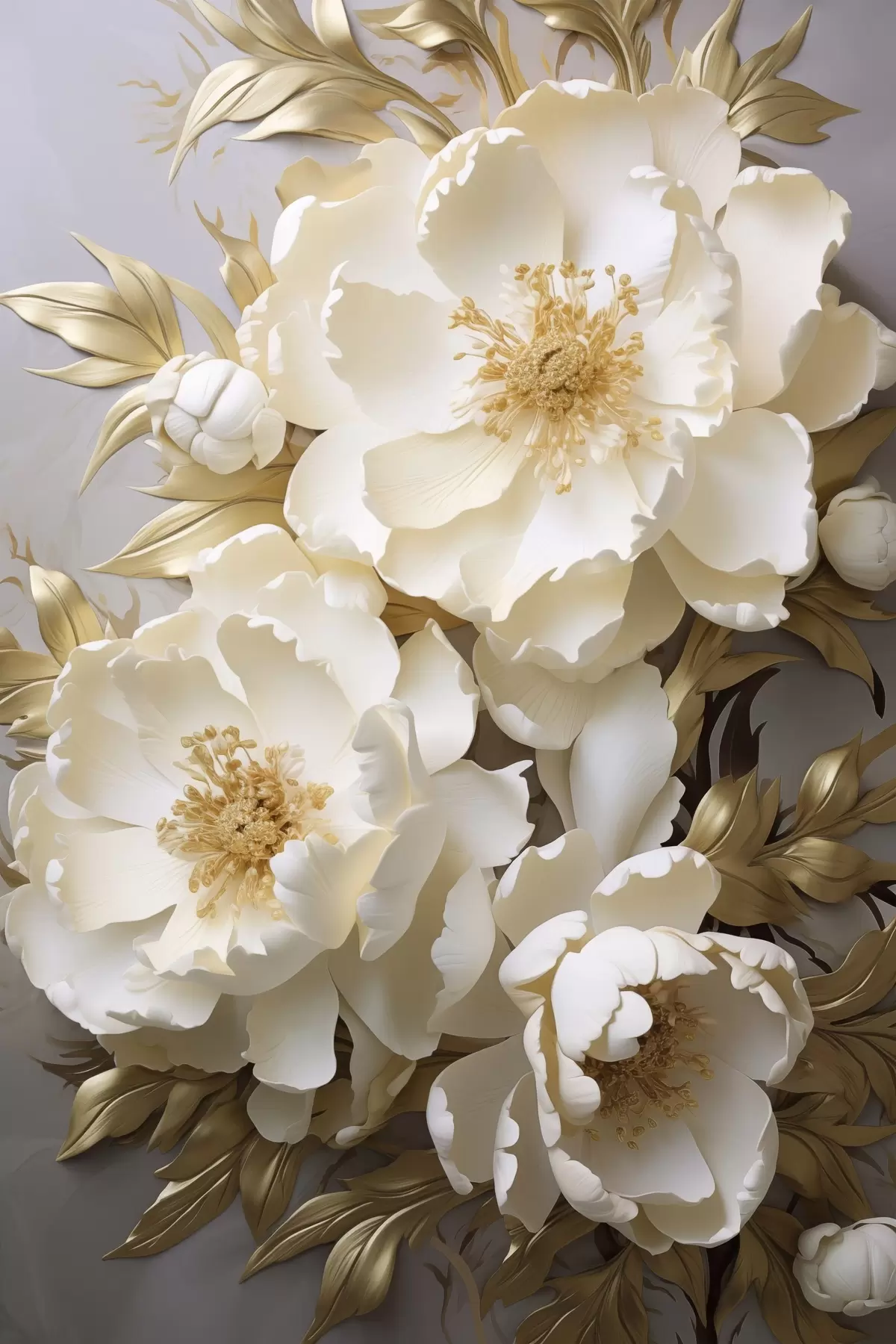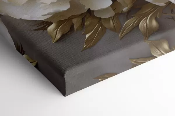 Obraz Veľké biele pivonky so žltými listami na sivom pozadí Nr. s48754