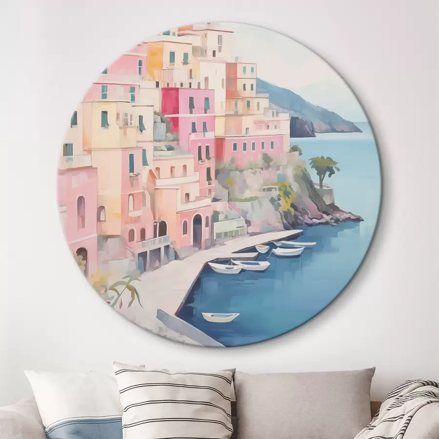 Farebná olejomaľba zobrazujúca prímorské mesto s bielymi domami a živou kvetinovou záhradou v popredí