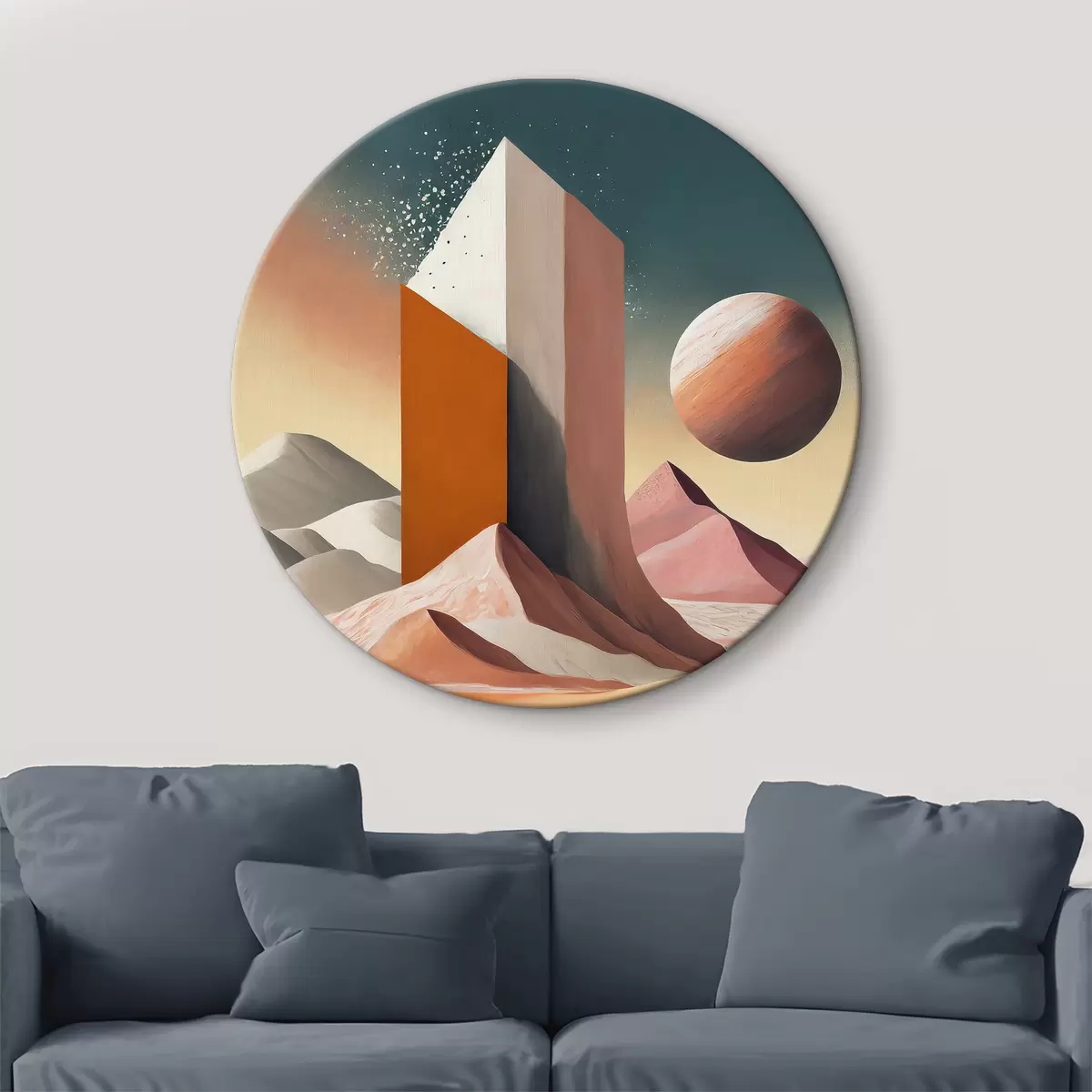 Obrázok Futuristické umenie, púšť, geometrické postavy, palmy, ružová a oranžová, planéta Nr r37369
