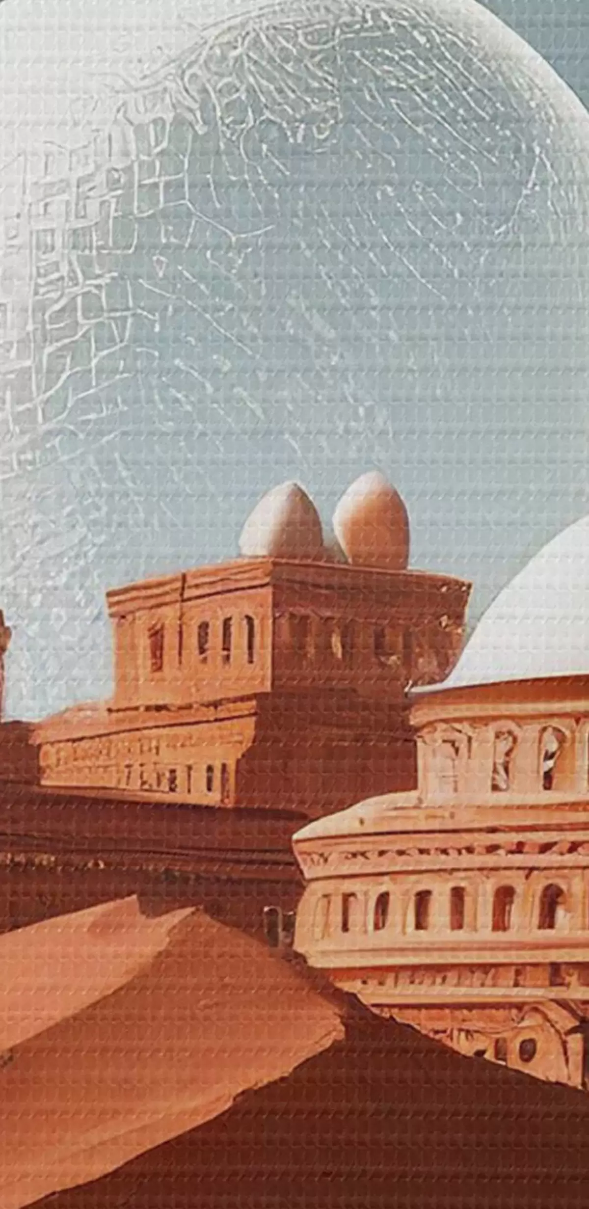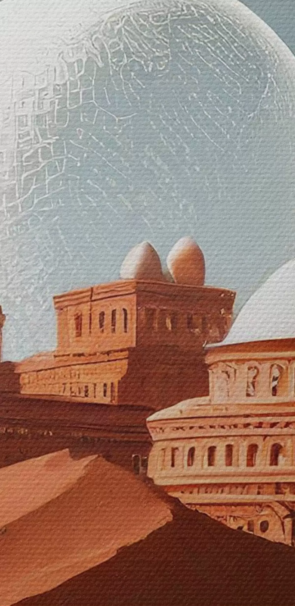Obrázok Púštna krajina s budovami a veľkou bielou guľou Nr r37814