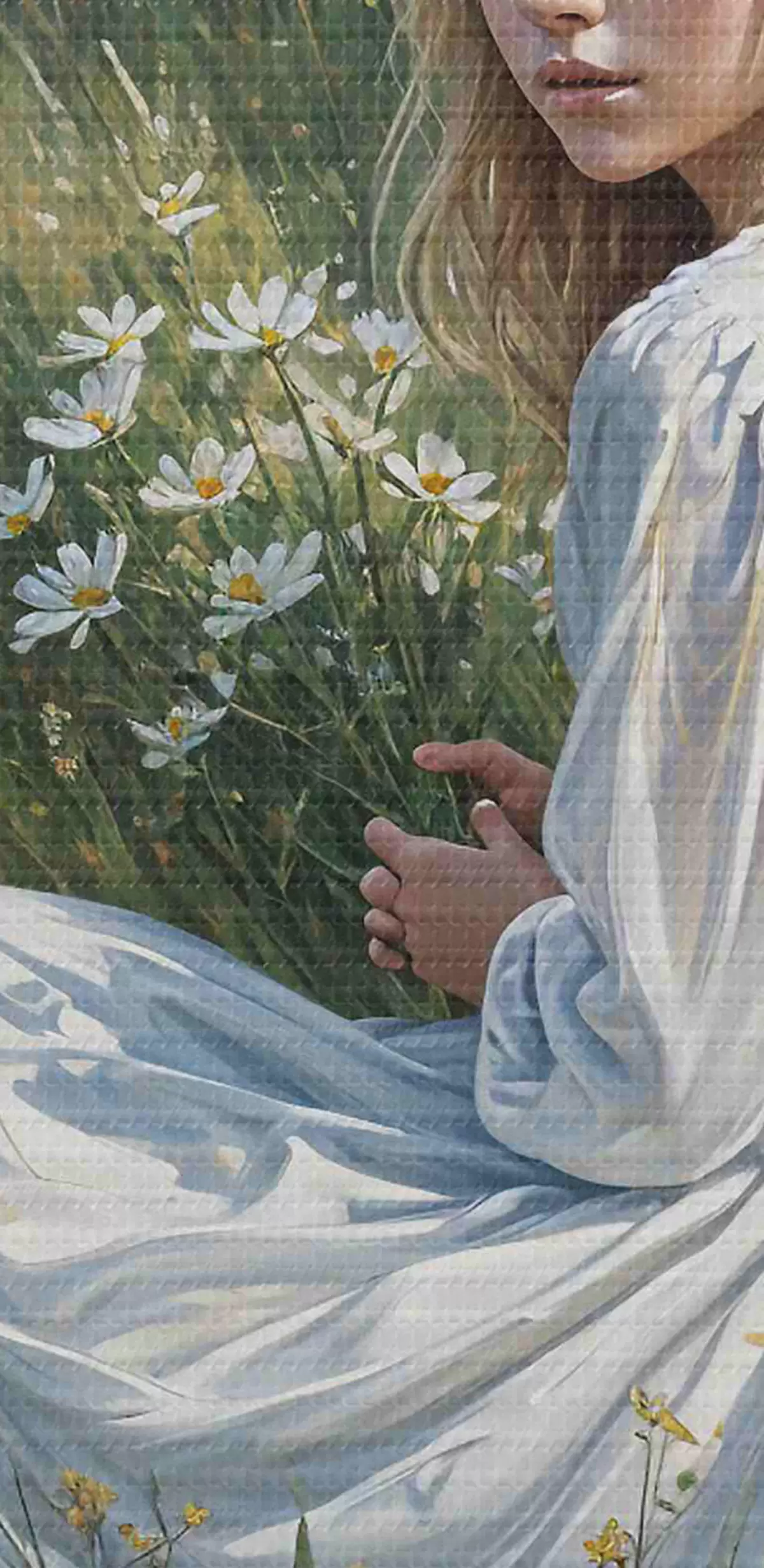 Obrázok Dievča v bielych šatách sedí na poli s kvetmi Nr r38196