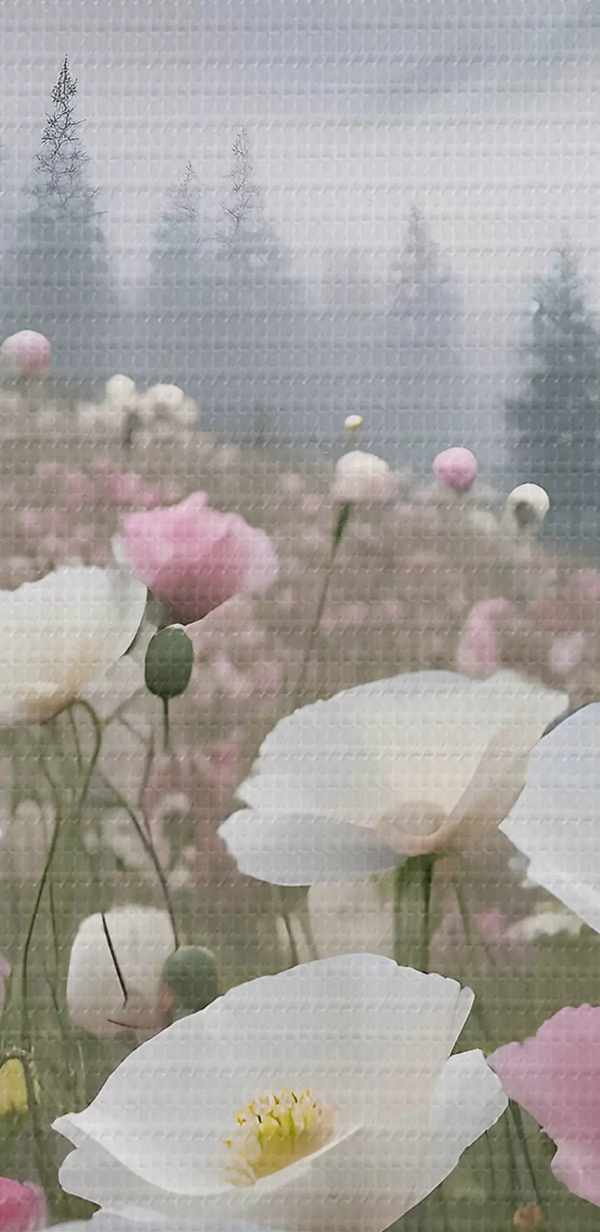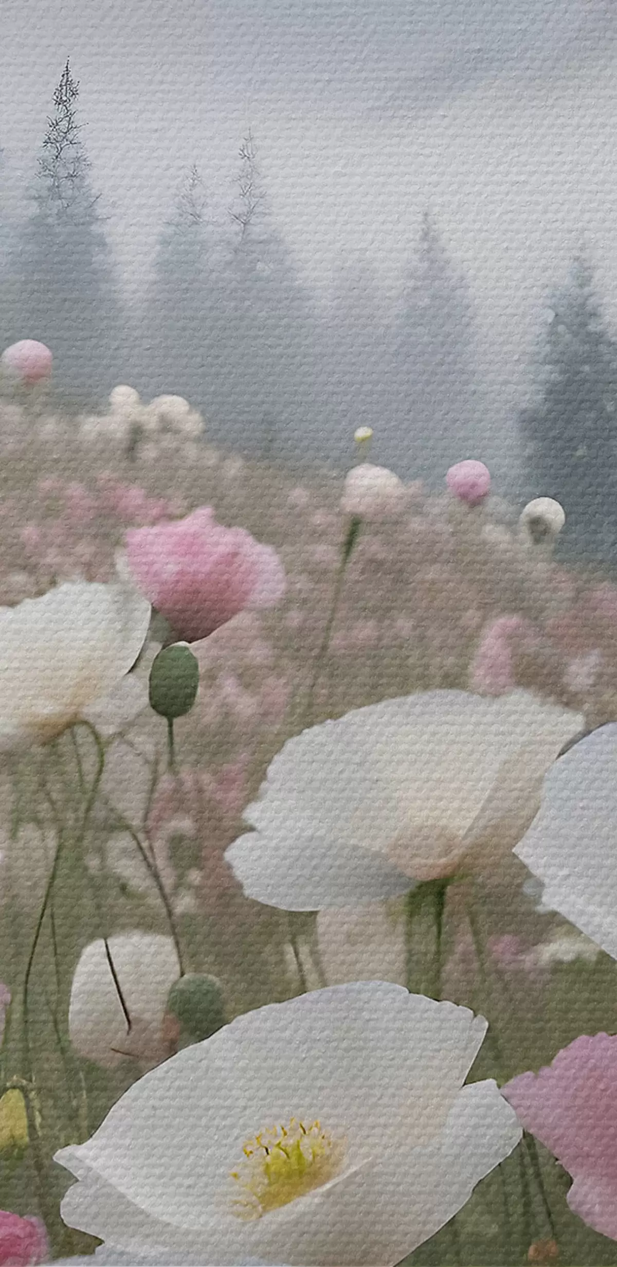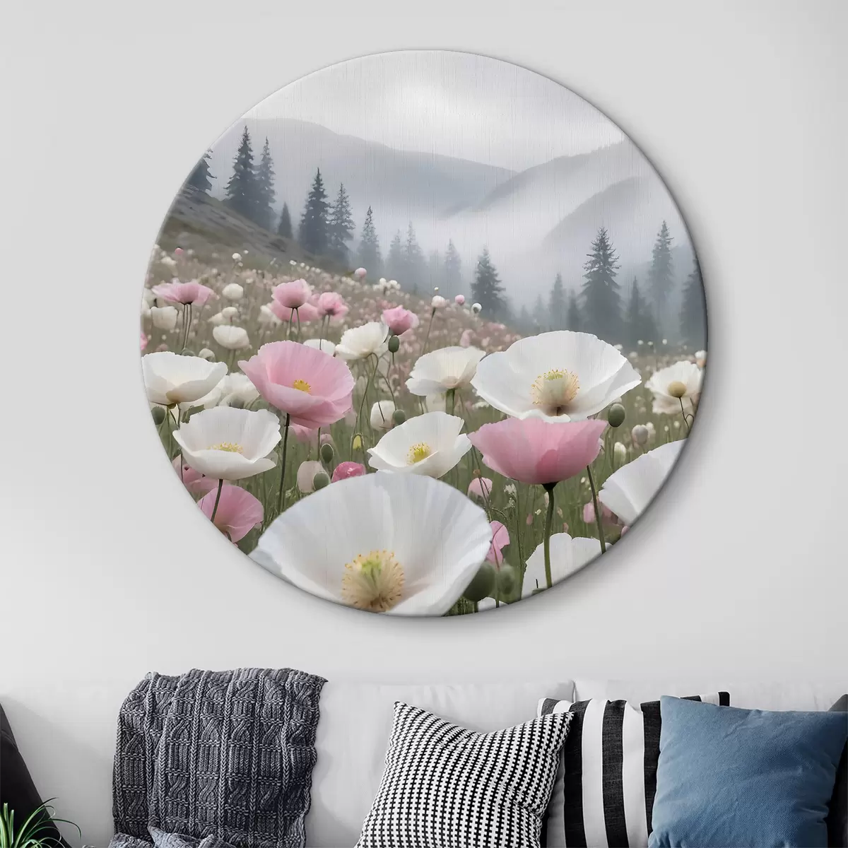 Obrázok Pole ružových a bielych makov v horskej krajine v pozadí Nr r38369