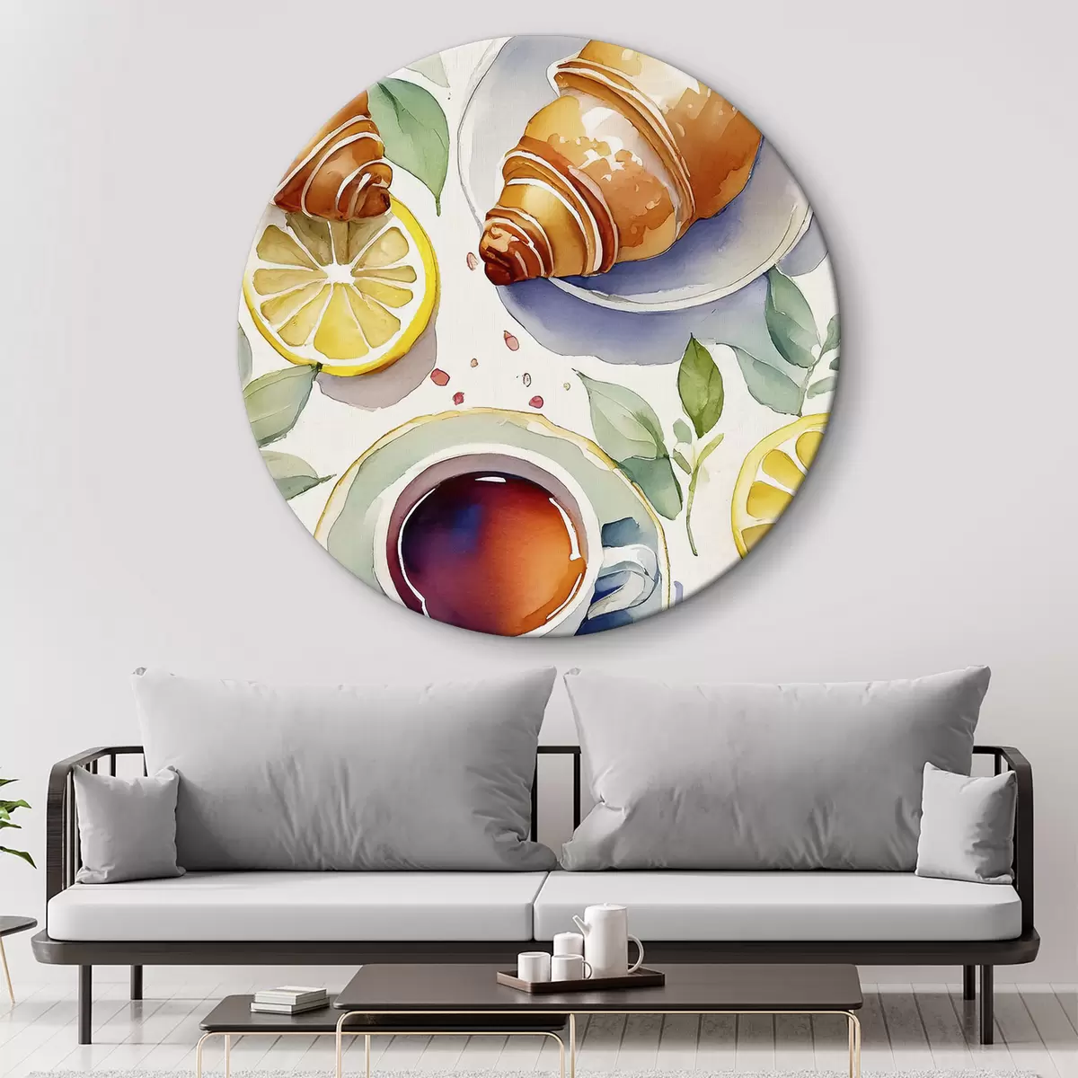 Obrázok Croissant akvarel, šálka čaju, raňajky, citróny, rustikálny štýl Nr r38389
