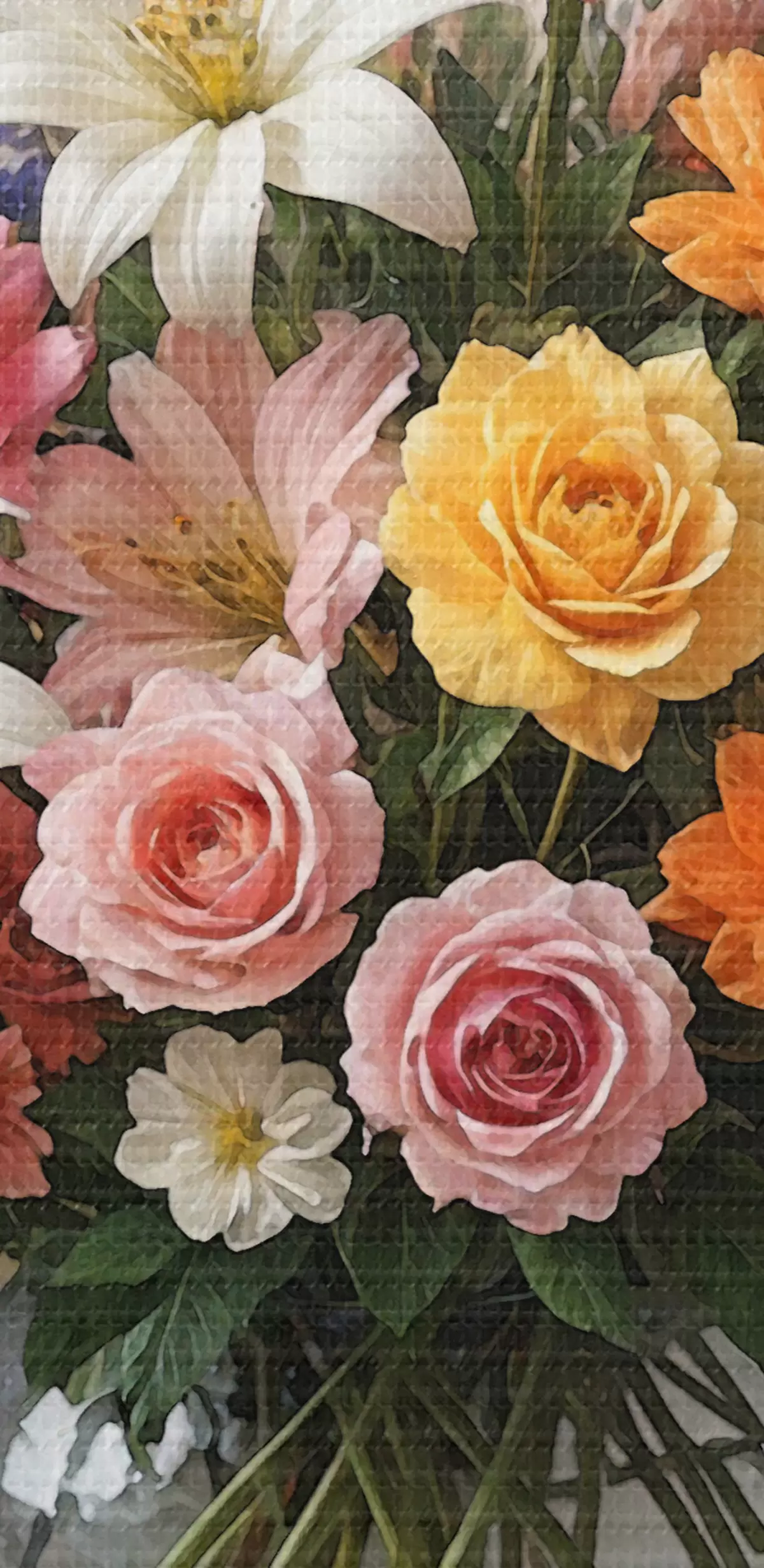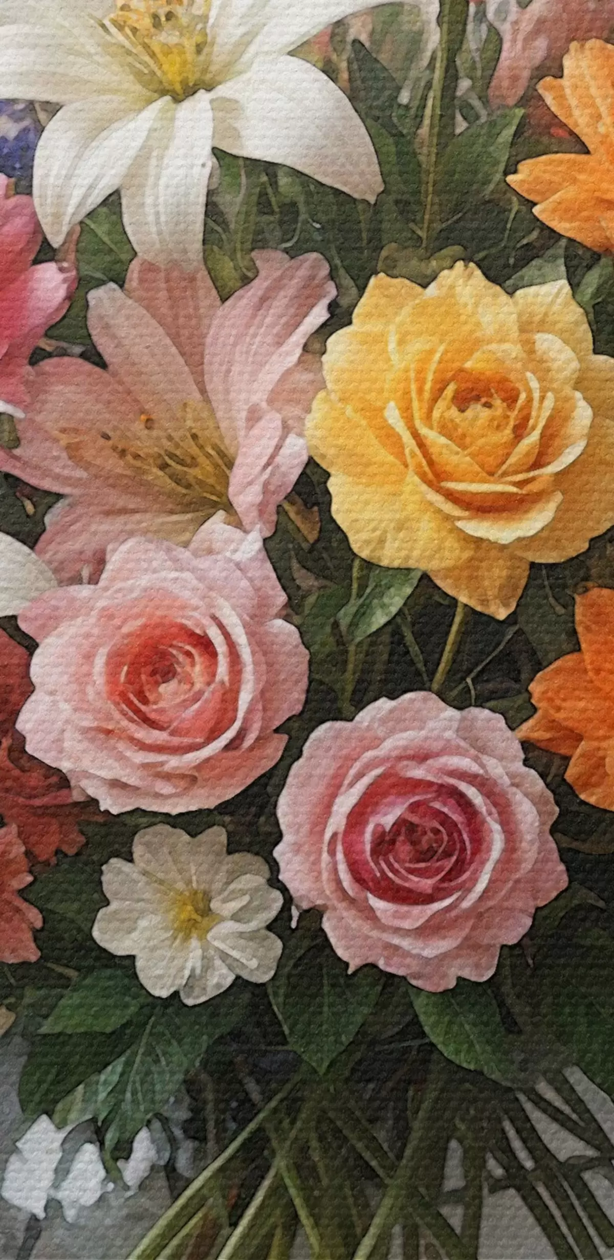 Obrázok Žiarivá kytica rôznych farebných kvetov v sklenenej váze na bielom obruse umelecká maľba vintage Nr r38825