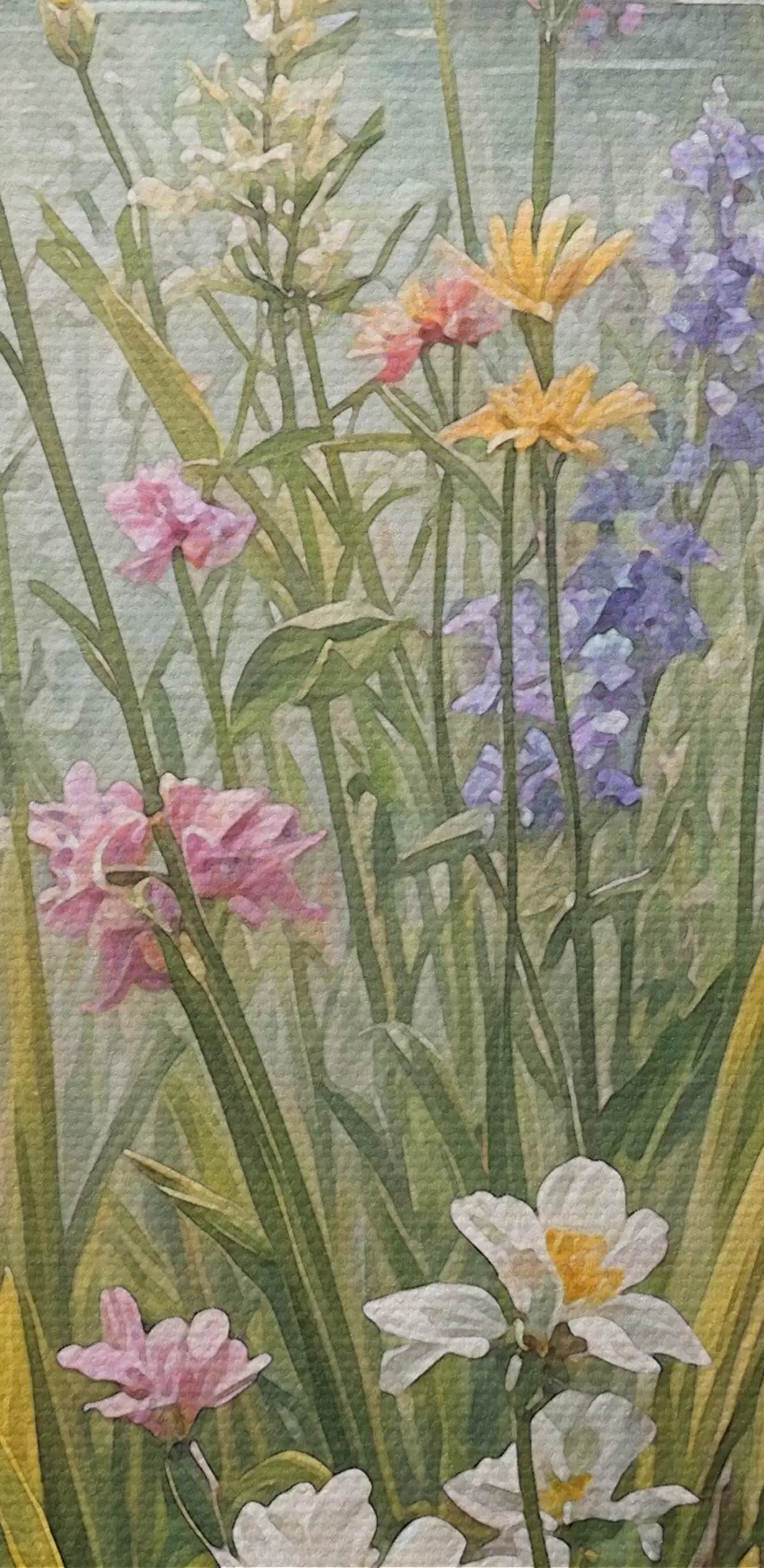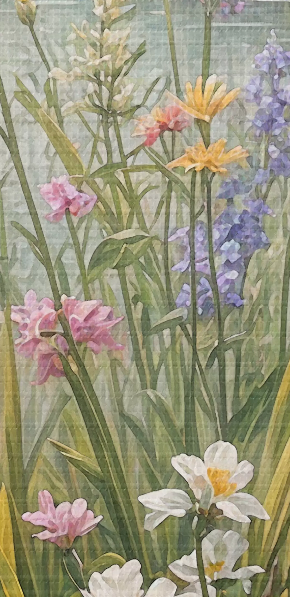 Obrázok Poľné kvety a vysoké trávy. Celková scéna zobrazuje živú prírodnú krajinu Nr r38829