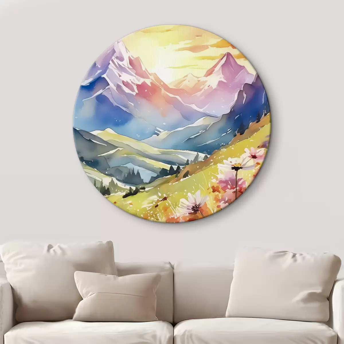 Obrázok Letné hory, farebný západ slnka, kvety, akvarel, prírodná krajina Nr r38840