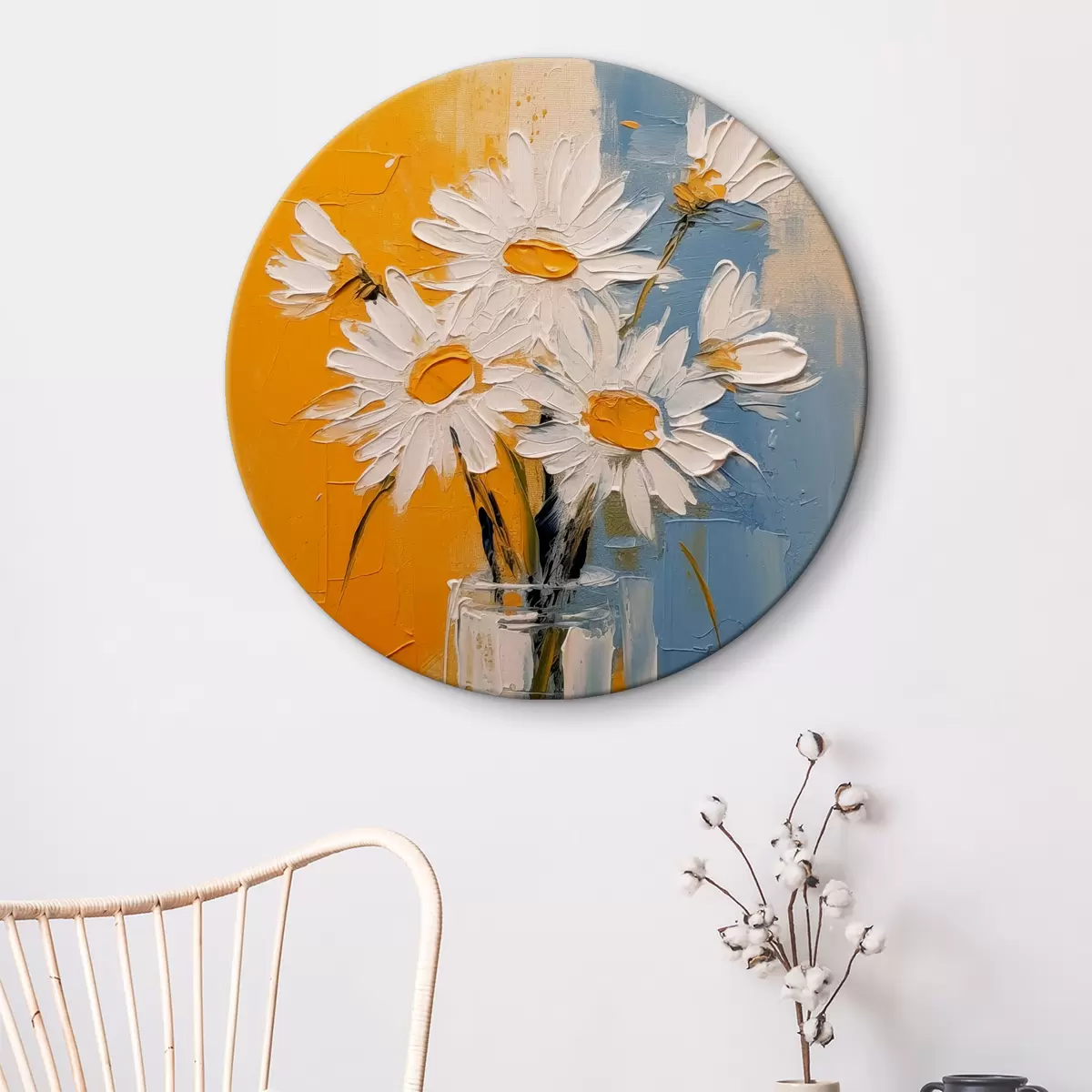 Obrázok Biele margarétky v sklenenej váze na modrom a žltom podklade, imitácia olejomaľby, veľké ťahy Nr r38907