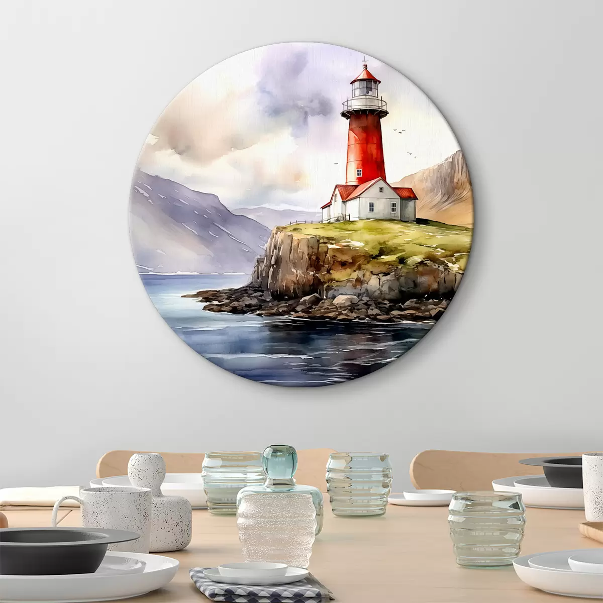 Obrázok Červený maják na svahu neďaleko zálivu na ostrove na pozadí hôr a zamračenej oblohy Nr r38912