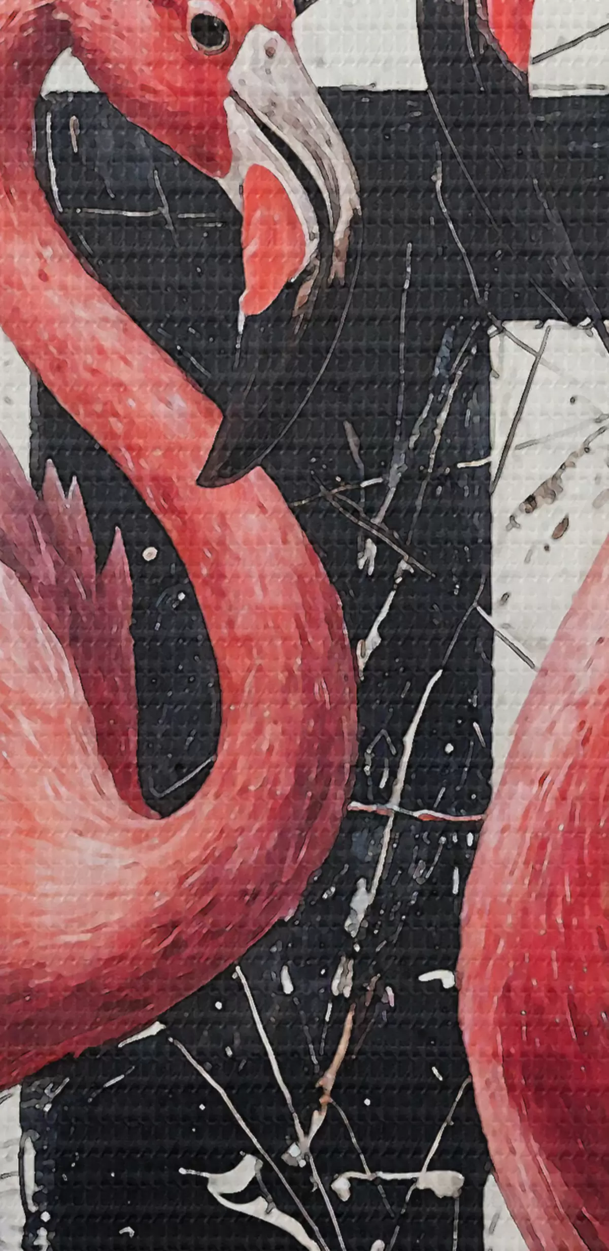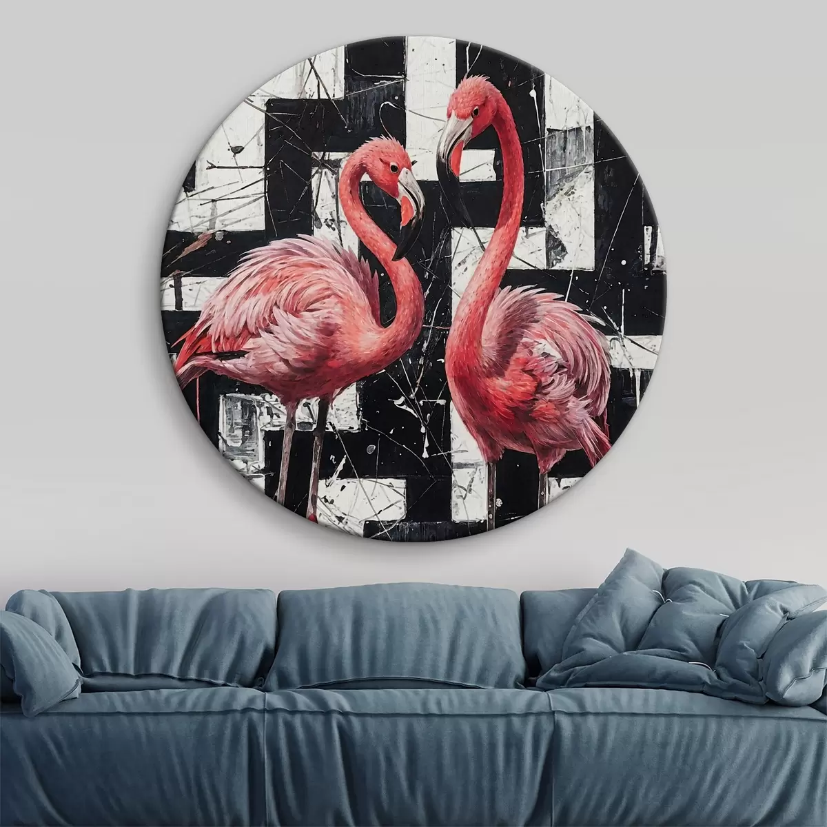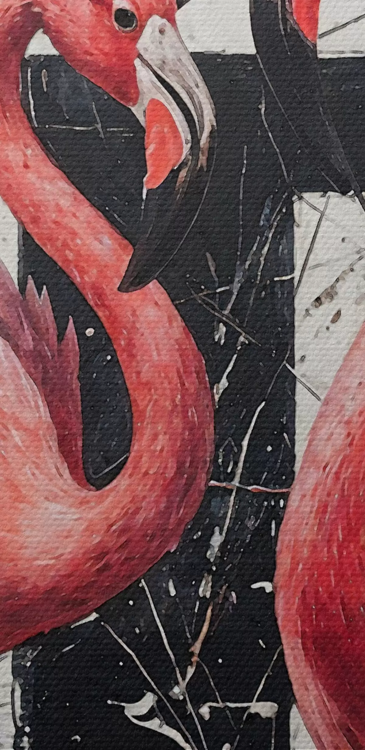 Obrázok Dva ružové plameniaky stojace pred čiernobielym abstraktným obrazom na pozadí Nr r38954