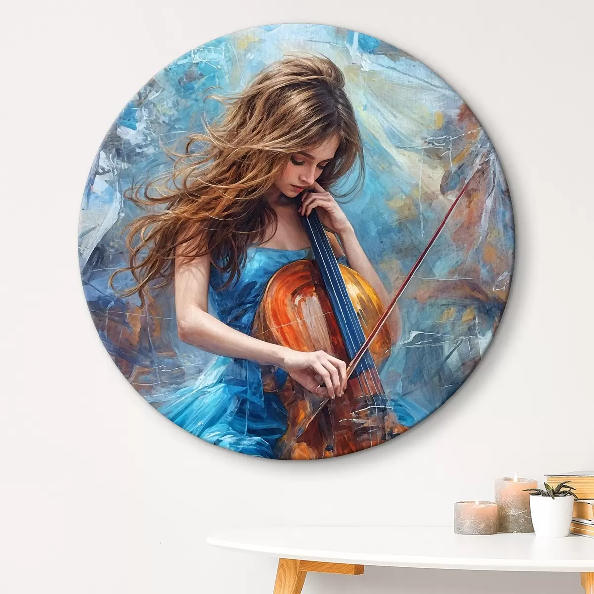 Obrázok Olejomaľba mladej ženy s dlhými rozpustenými červenými vlasmi, ktorá hrá na violončelo na abstraktnom pozadí Nr r38956