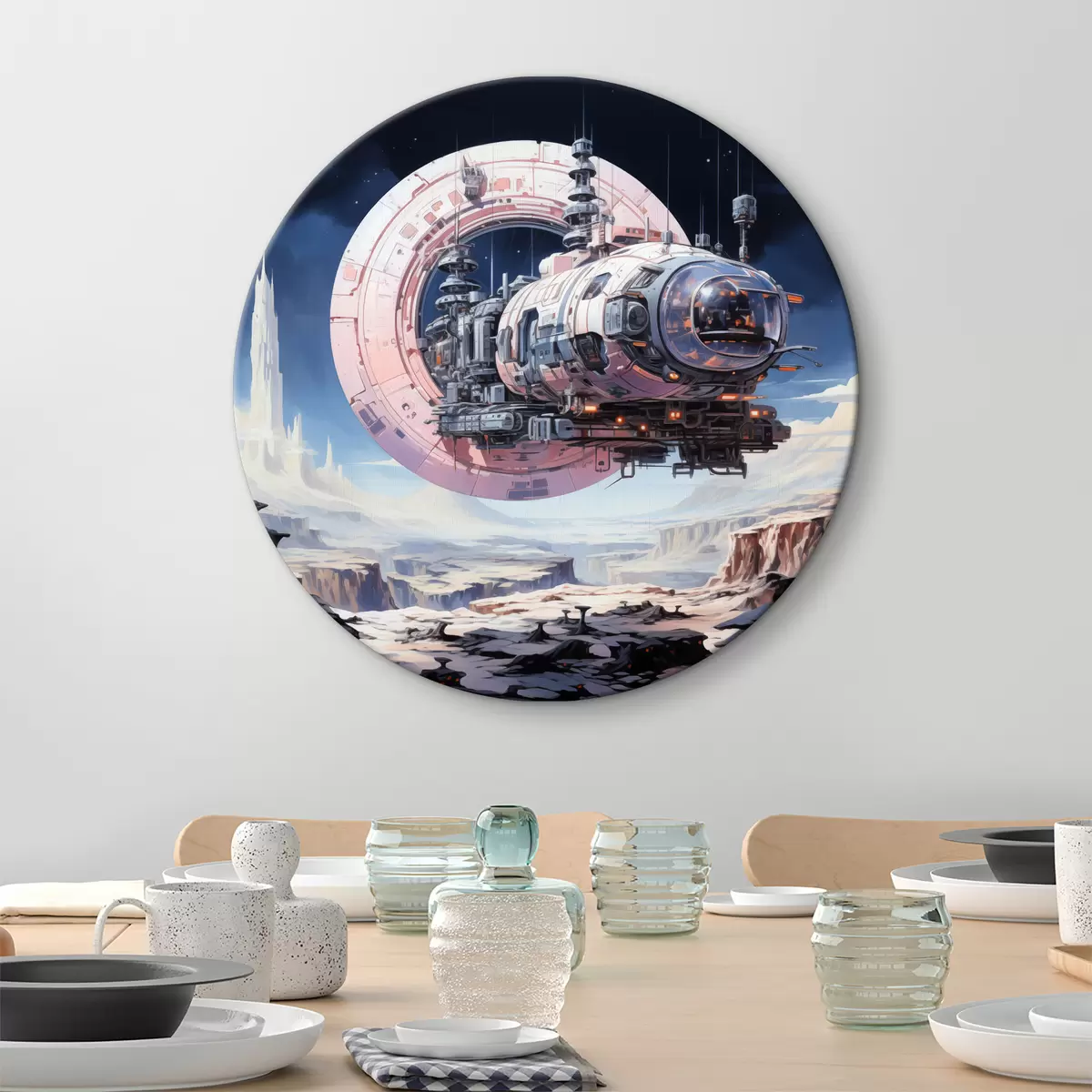 Obrázok Vesmírna loď v kyberpunkovom štýle letí vo vesmíre nad asteroidom a planétou, modrá, béžová, ružová, biela farba Nr r39115