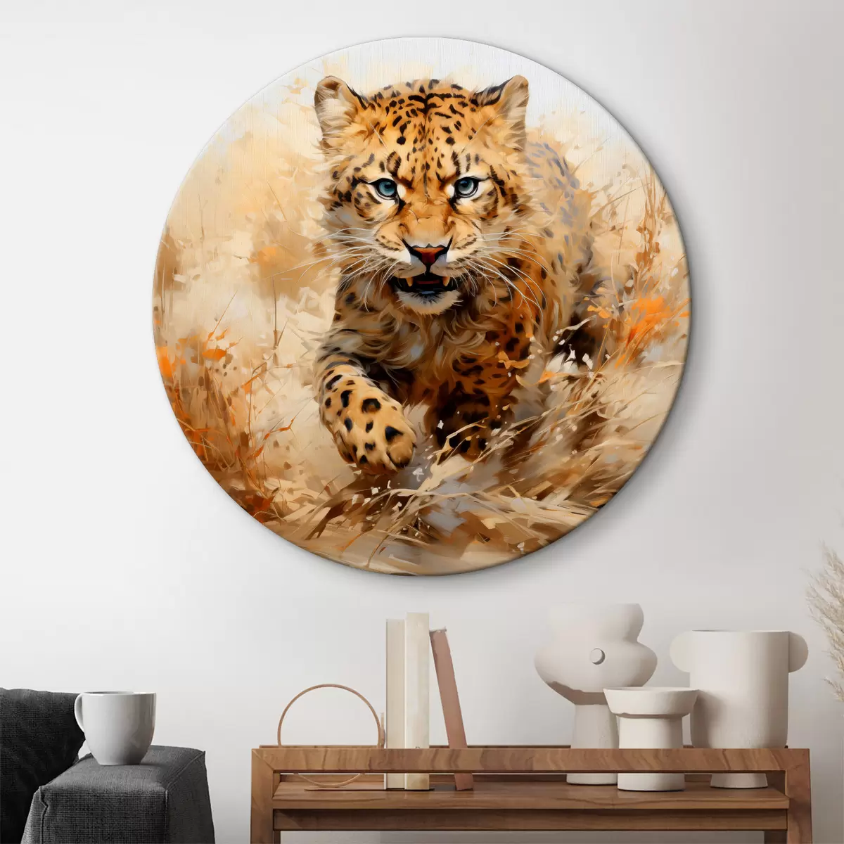 Obrázok Gepard s modrými očami a tesákmi sedí na olejomaľbe suchej trávy v abstraktnom umení Nr r39182