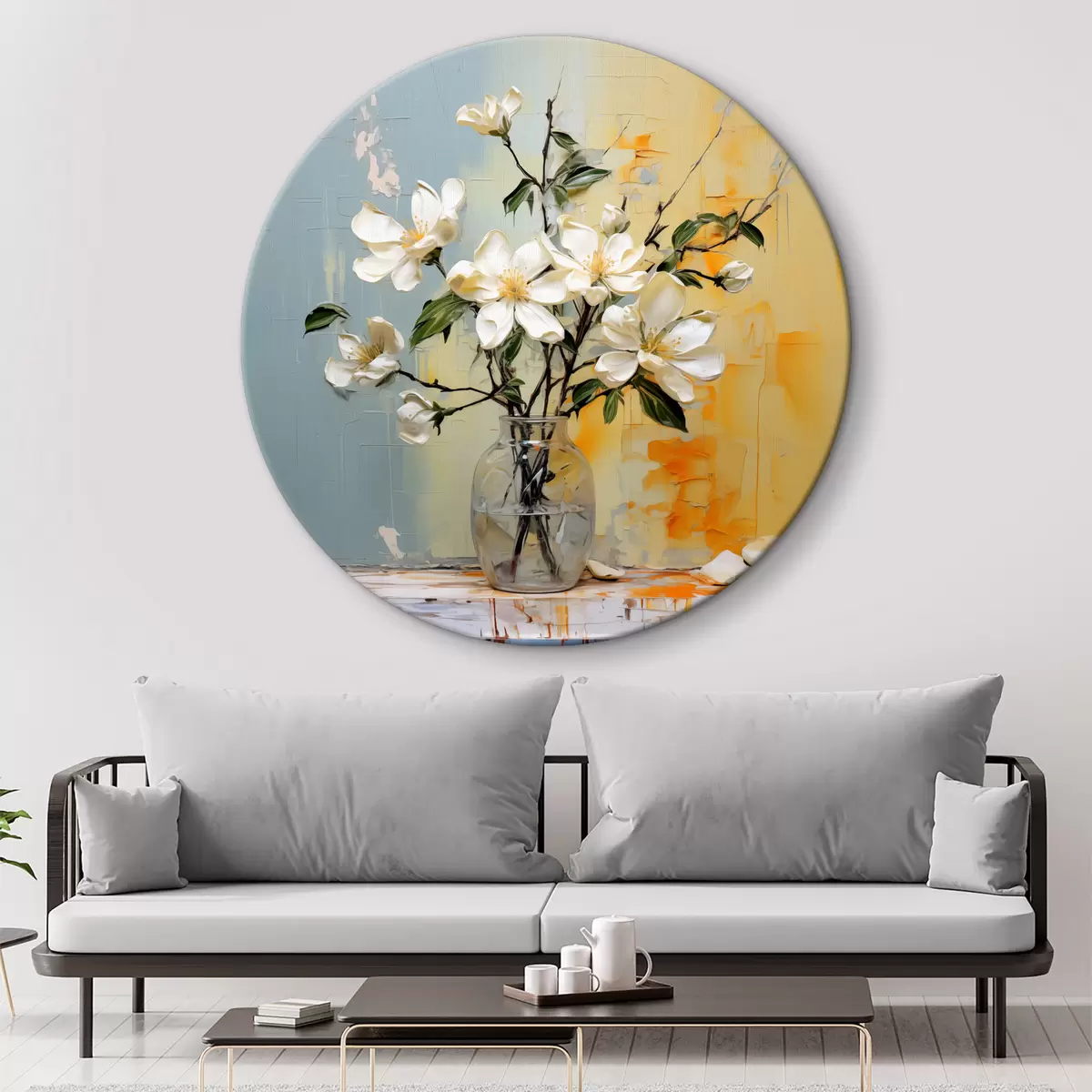 Obrázok Vetvičky s bielymi jazmínovými kvetmi v sklenenej váze olejomaľba abstraktné umenie, modrá a žltá farba Nr r39183