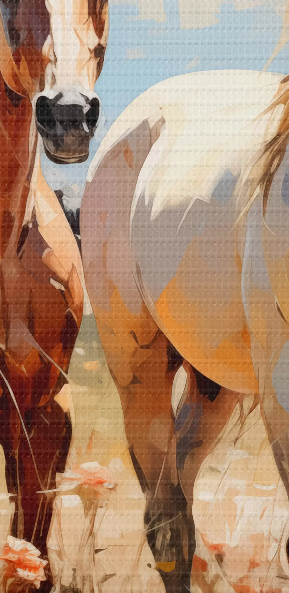Obrázok Biele a hnedé kone sa pasú na lúke medzi divokými kvetmi, olejomaľba abstraktného umenia Nr r39187