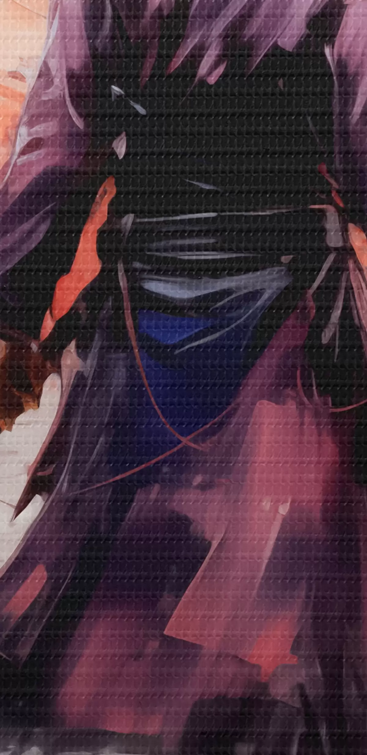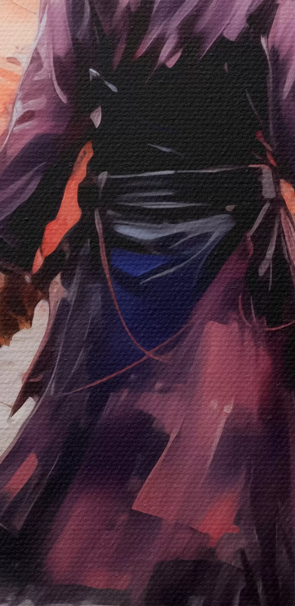 Obrázok Samuraj s mečom vo fialovom plášti kráča smerom k abstraktnej umeleckej maľbe hôr Nr r39194