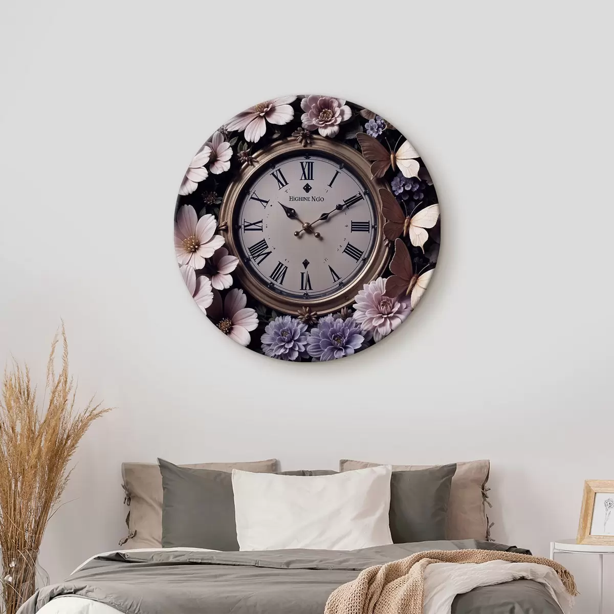 Obrázok Starožitné hodiny obklopené krásnymi fialovými a ružovými kvetmi na tmavom pozadí Nr r39386