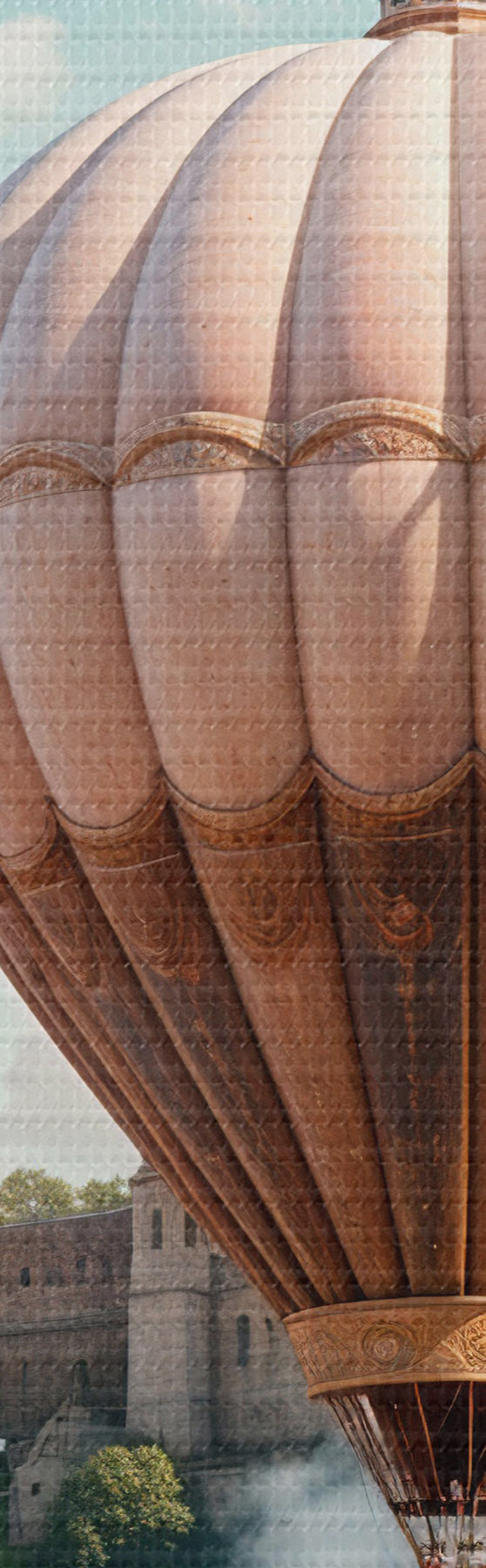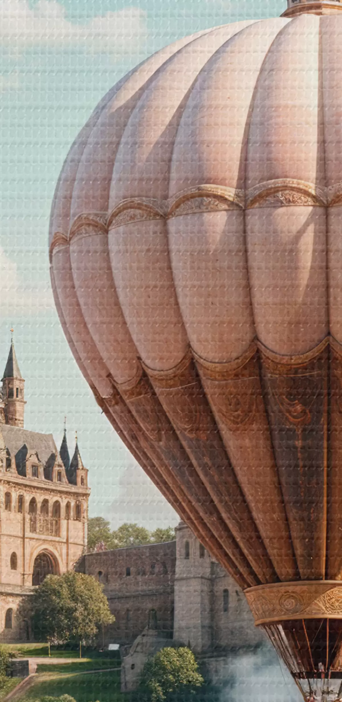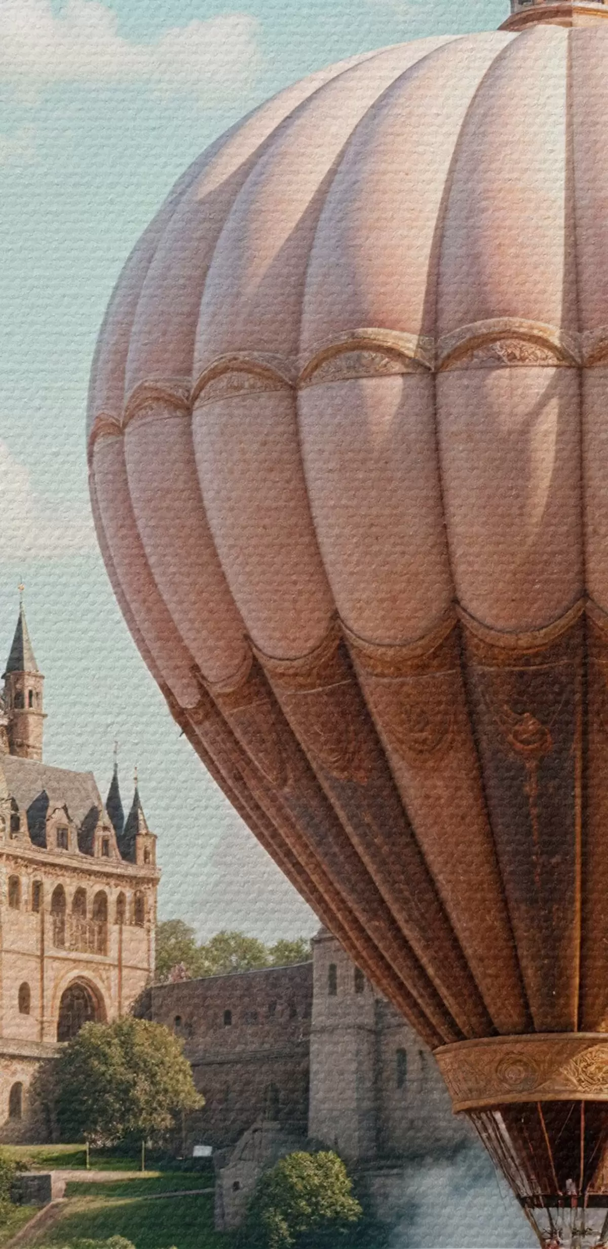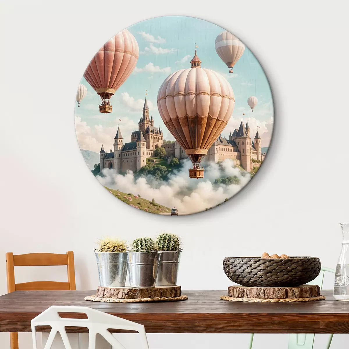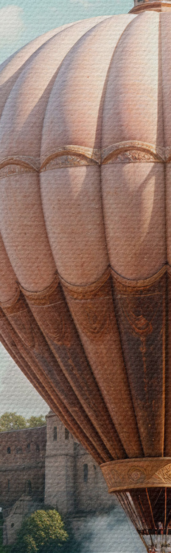 Obrázok Fantasy hrad obklopený ružovými teplovzdušnými balónmi plávajúcimi na zamračenej oblohe nad sviežou zelenou krajinou Nr r39387