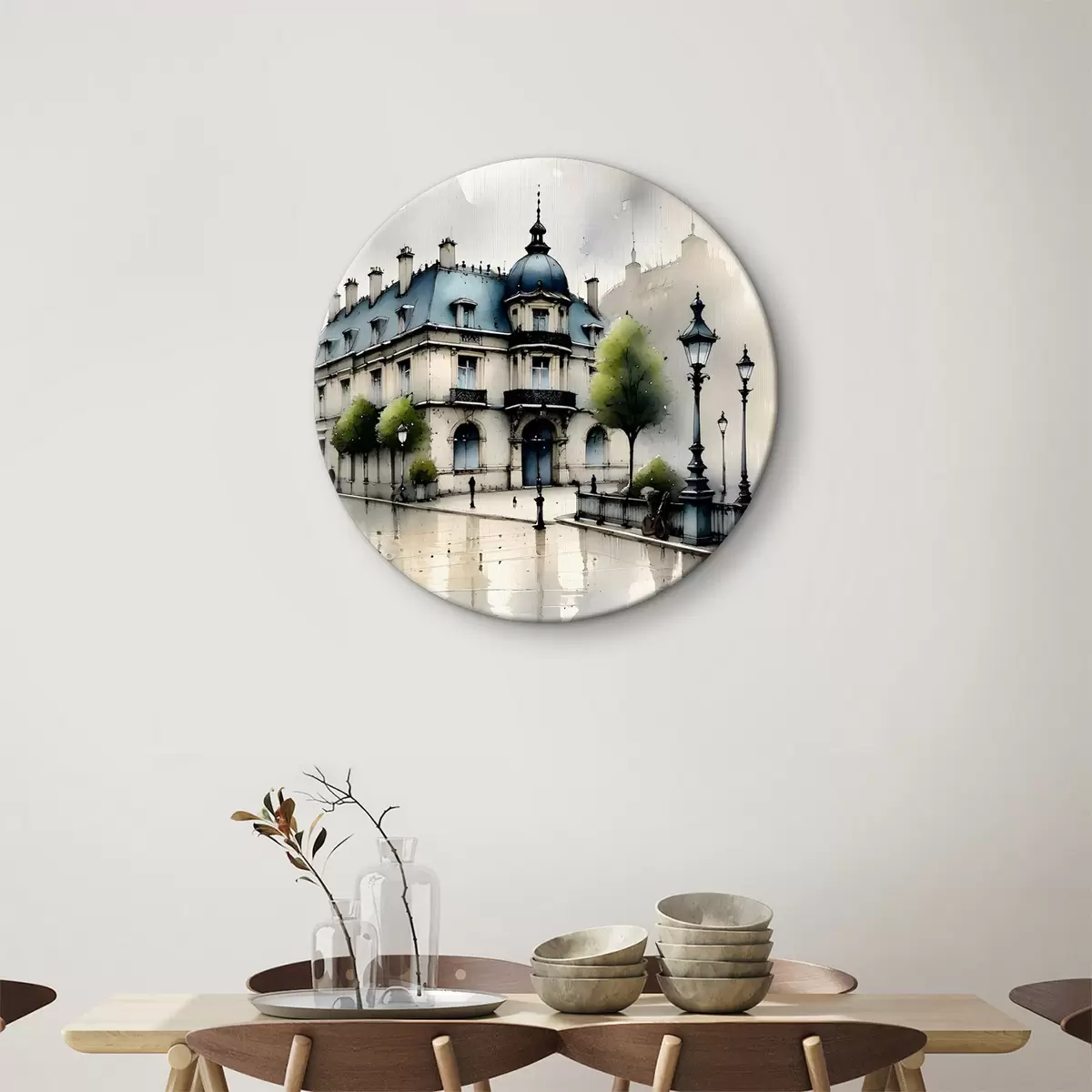 Obrázok Veľkolepá budova akvarelu obklopená kandelábrmi a stromami počas daždivého dňa Nr r39391
