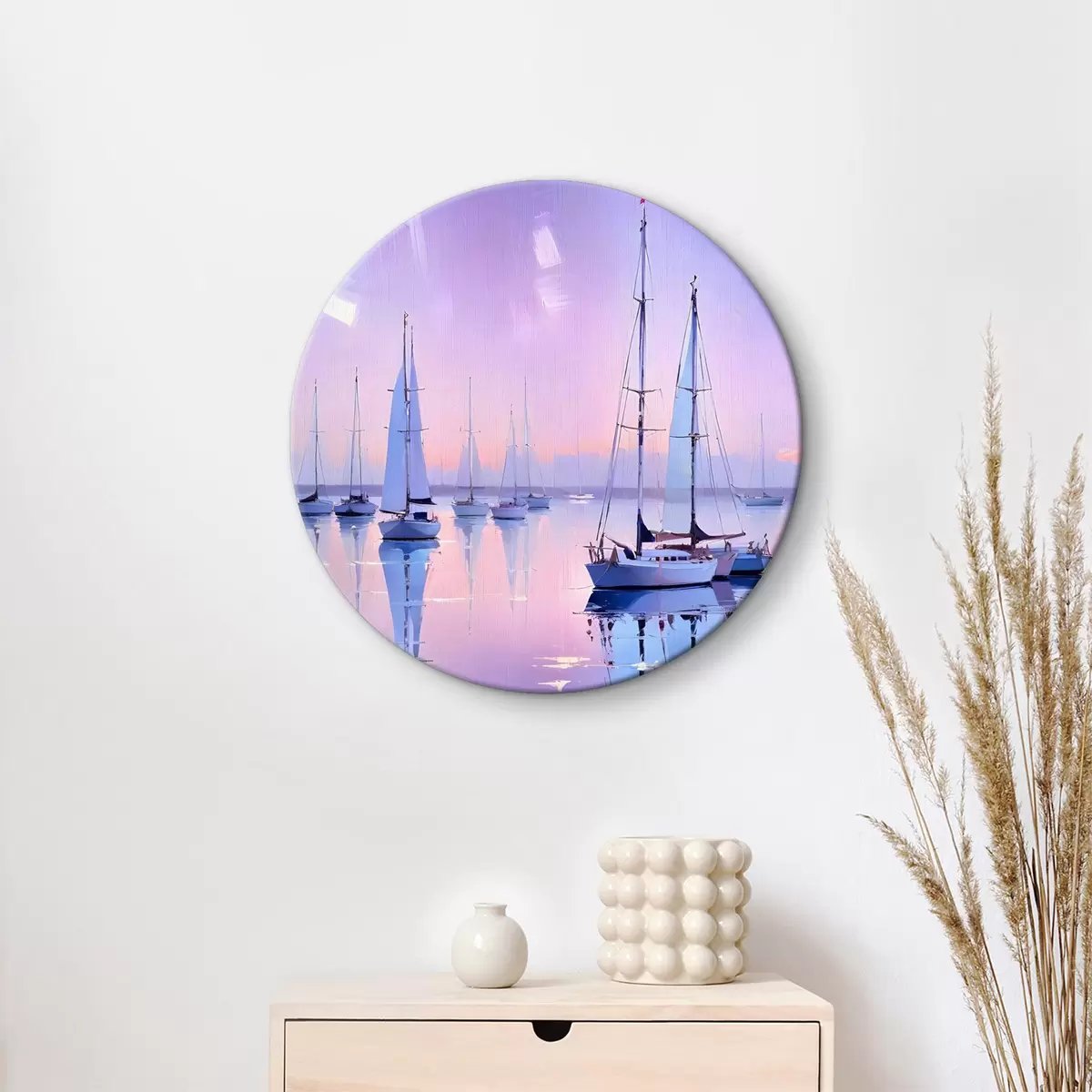 Obrázok Plachetnice na pokojnom jazere pri západe slnka, pričom lode sa odrážajú v krajinnom umení so stojatou vodou Nr r39398