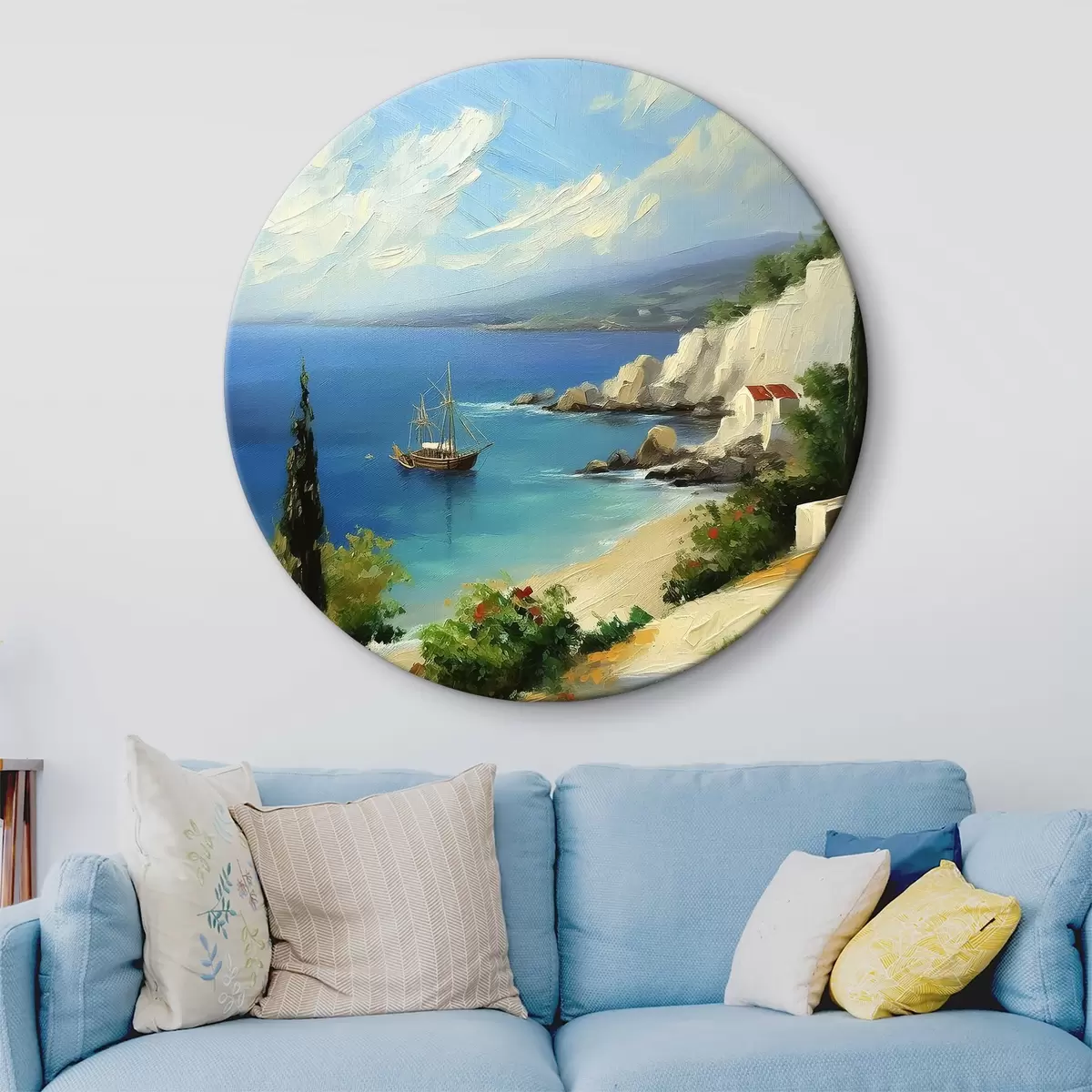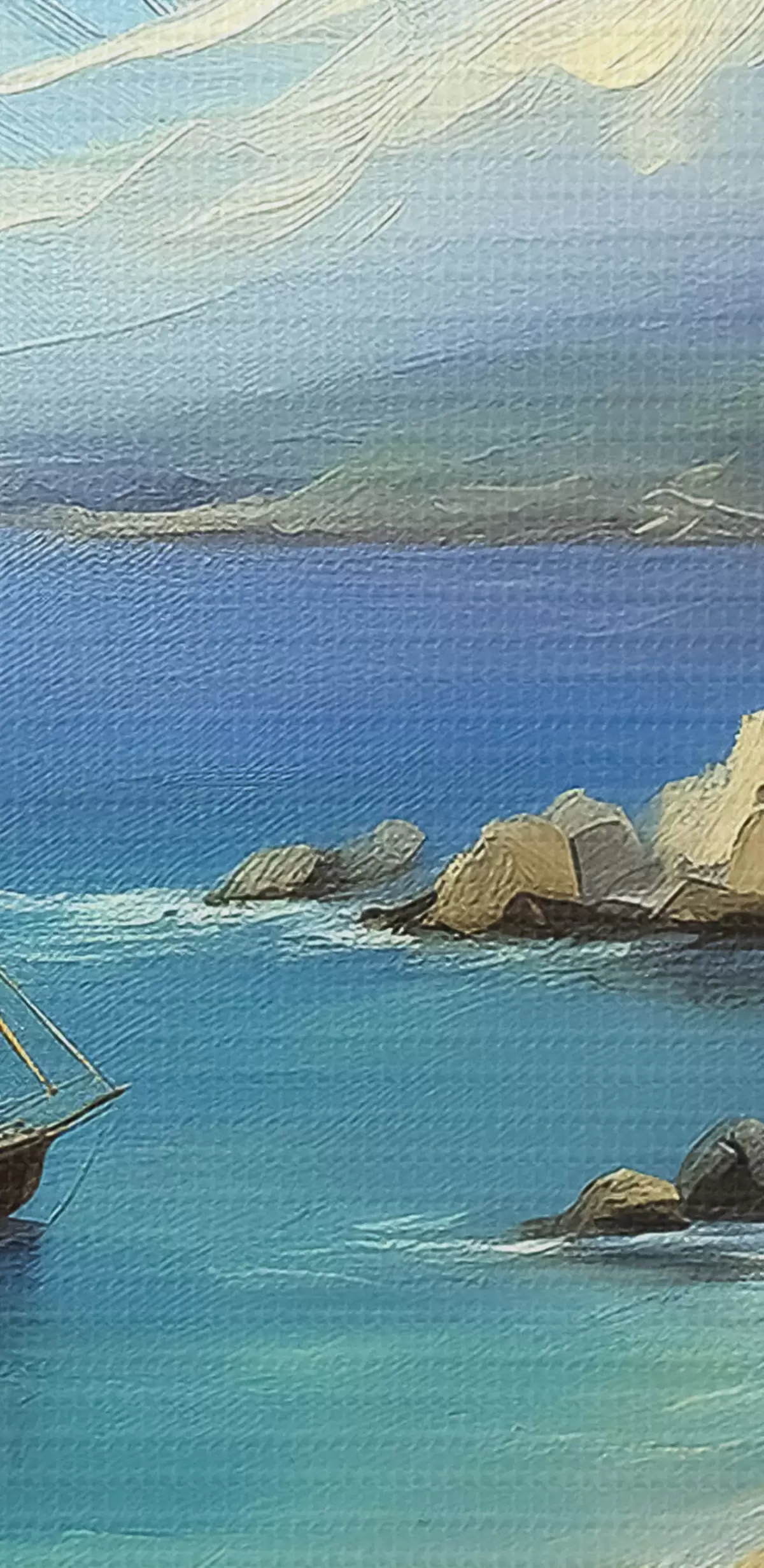 Obrázok Grécko morské pobrežie, loď, modrá voda, olejomaľba, letná príroda, skaly, živé ťahy štetcom Nr r39425