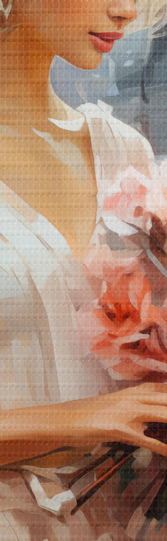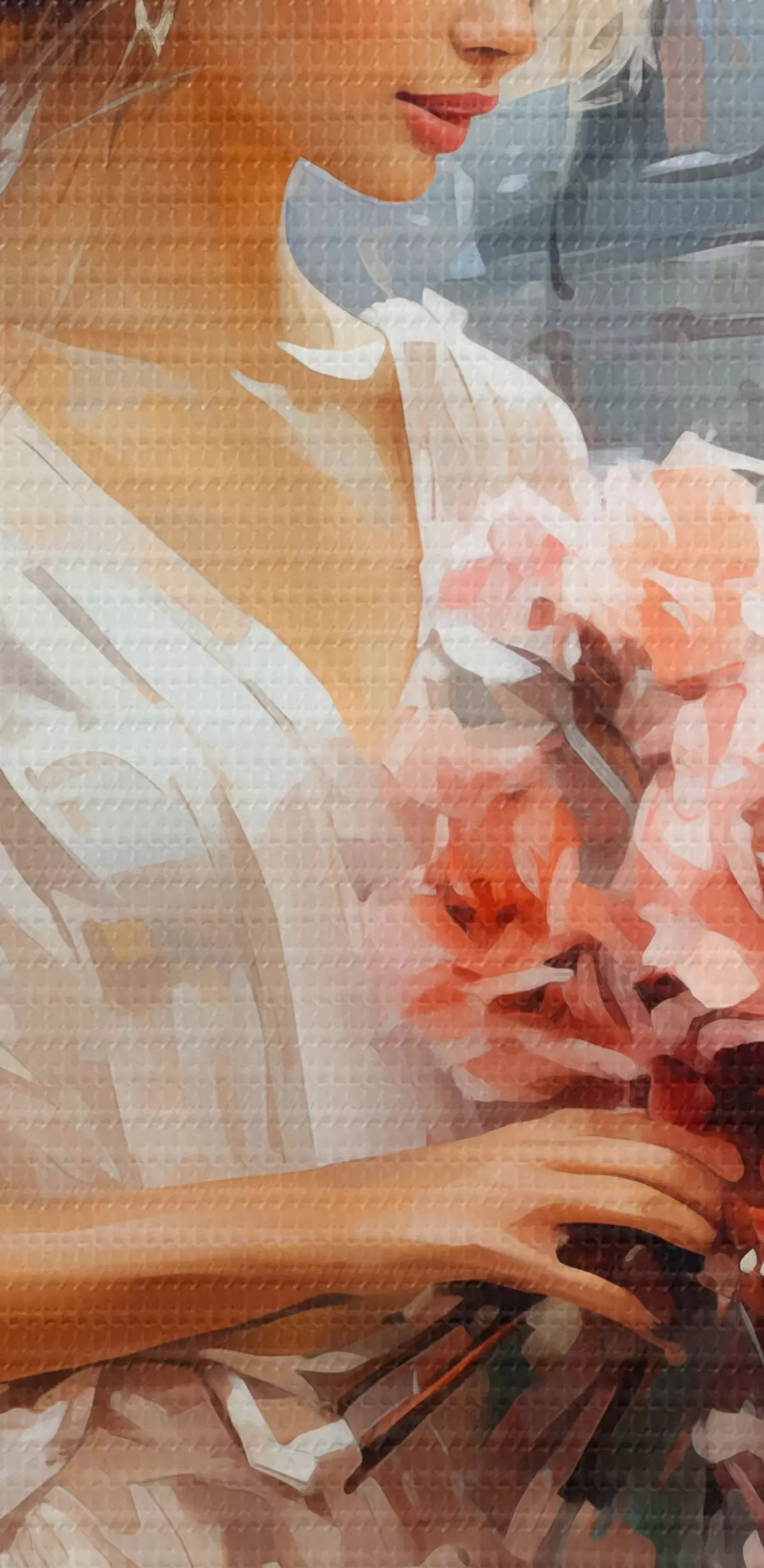 Obrázok Dievča v bielych šatách na stanici drží v rukách olejomaľbu kyticu ružových ruží Nr r39438