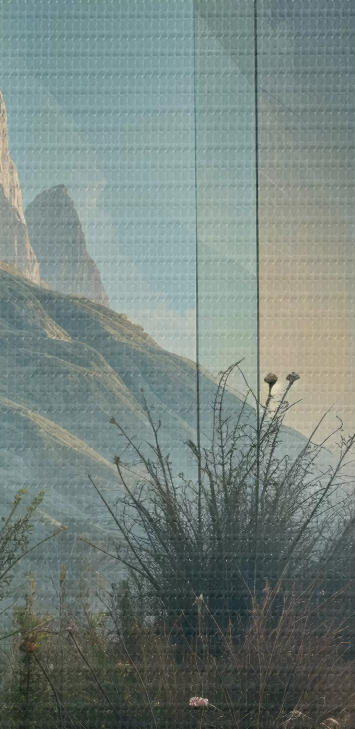 Obrázok Svieža, zarastená záhrada s vysokou trávou, divokými kvetmi a zahmlenou horskou abstraktnou krajinou Nr r39522