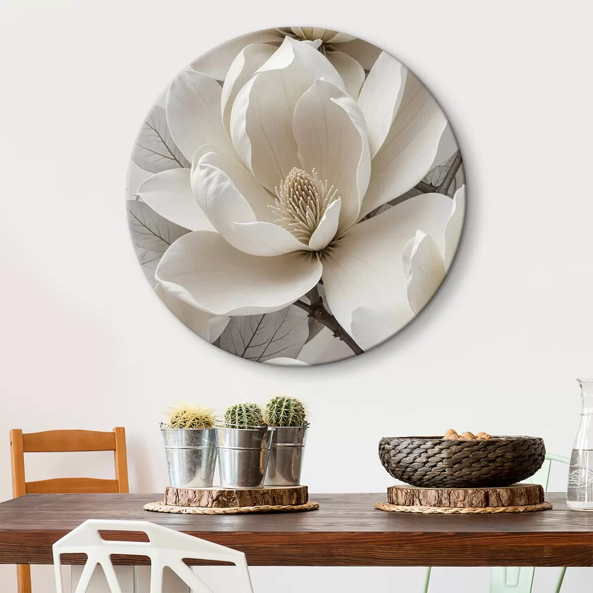 Obrázok Biely kvet magnólie s jemnými okvetnými lístkami obklopený zelenými listami na svetlom pozadí Nr r39527