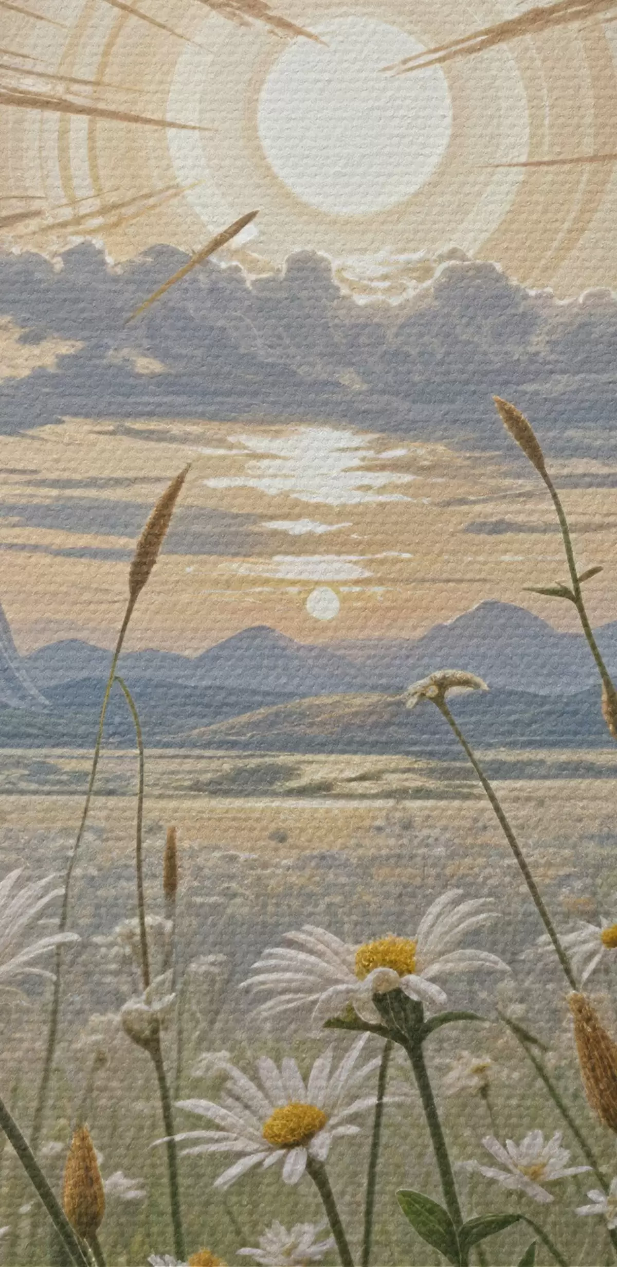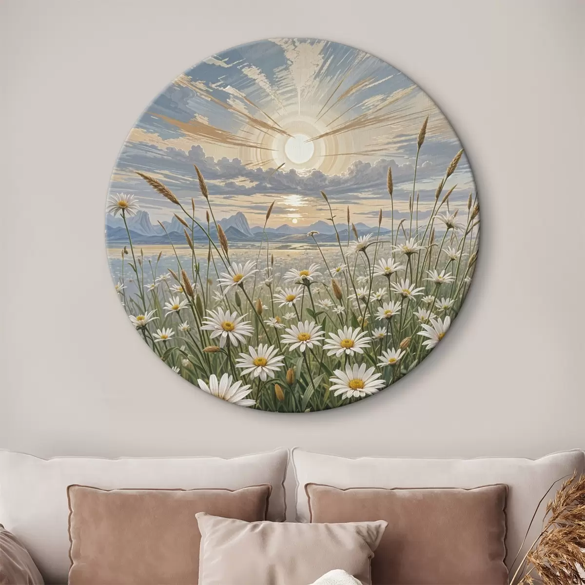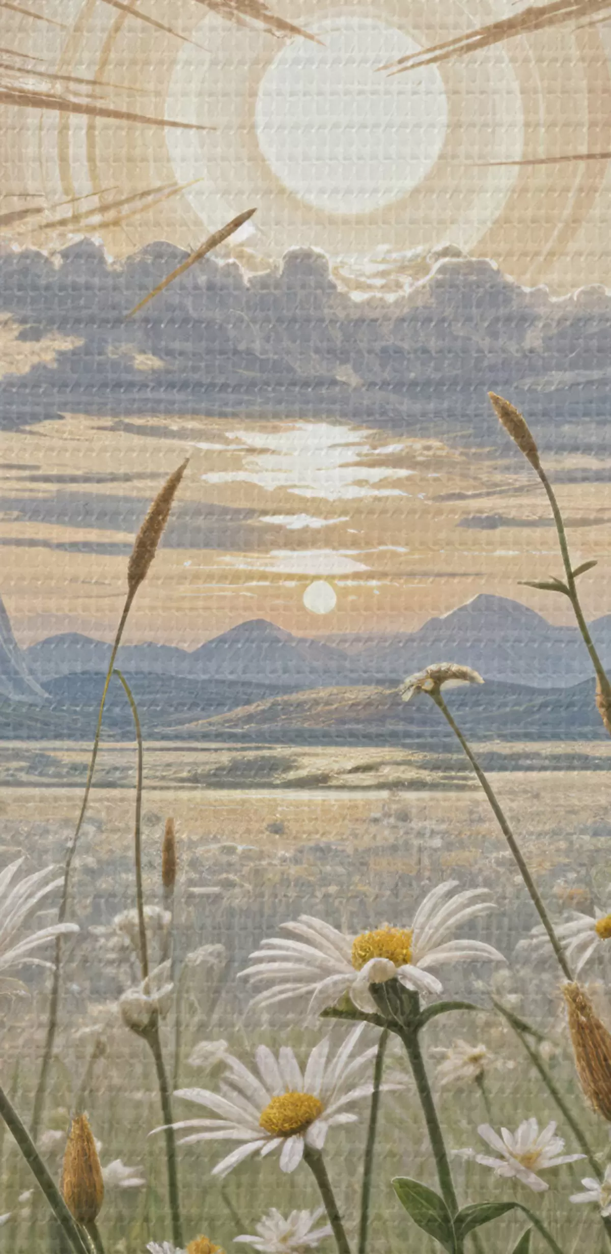 Obrázok Pole bielych kvetov sedmokrásky v popredí s krajinou hôr a zamračenou oblohou Nr r39528