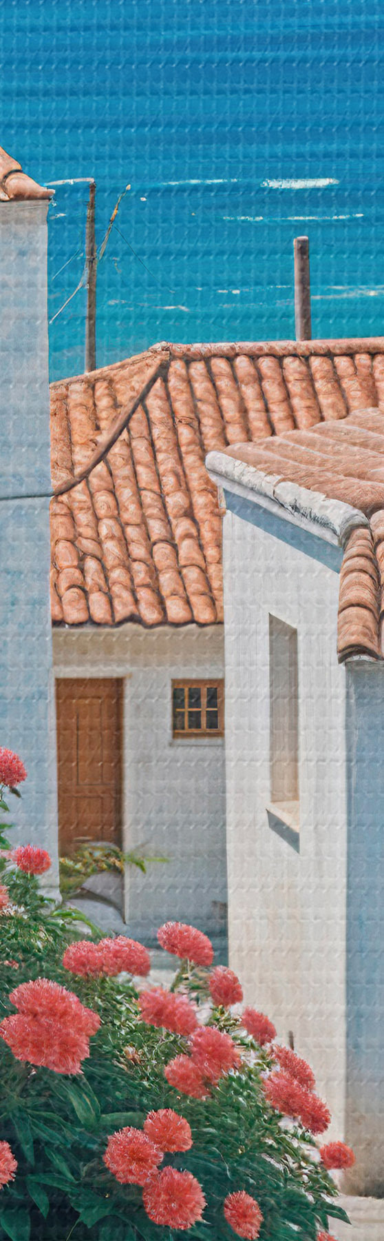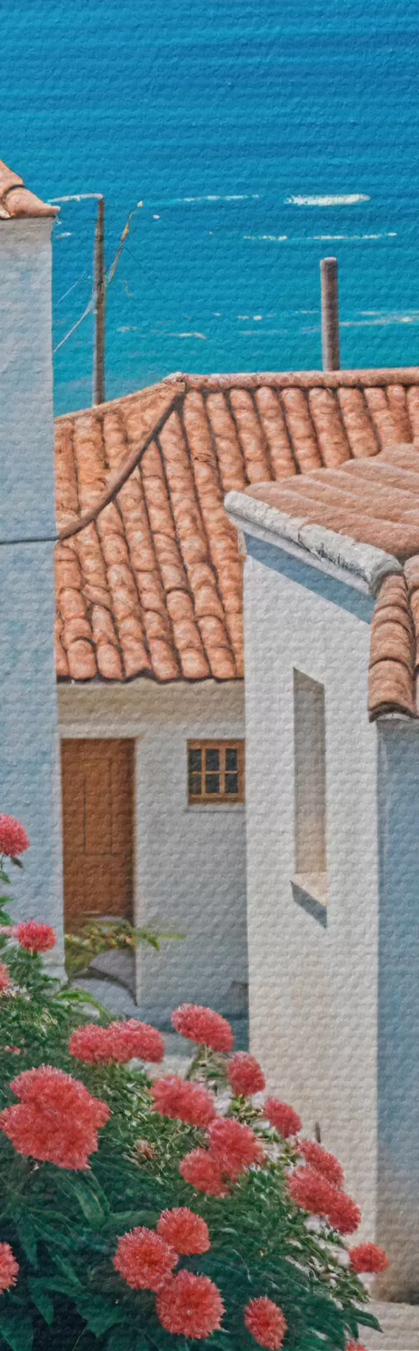 Obrázok Úzka ulička v pobrežnom meste s bielymi budovami, červenými škridlovými strechami a žiarivými ružovými kvetmi Nr r39532