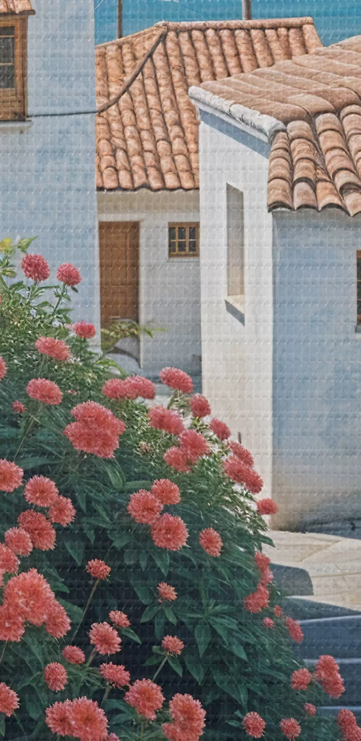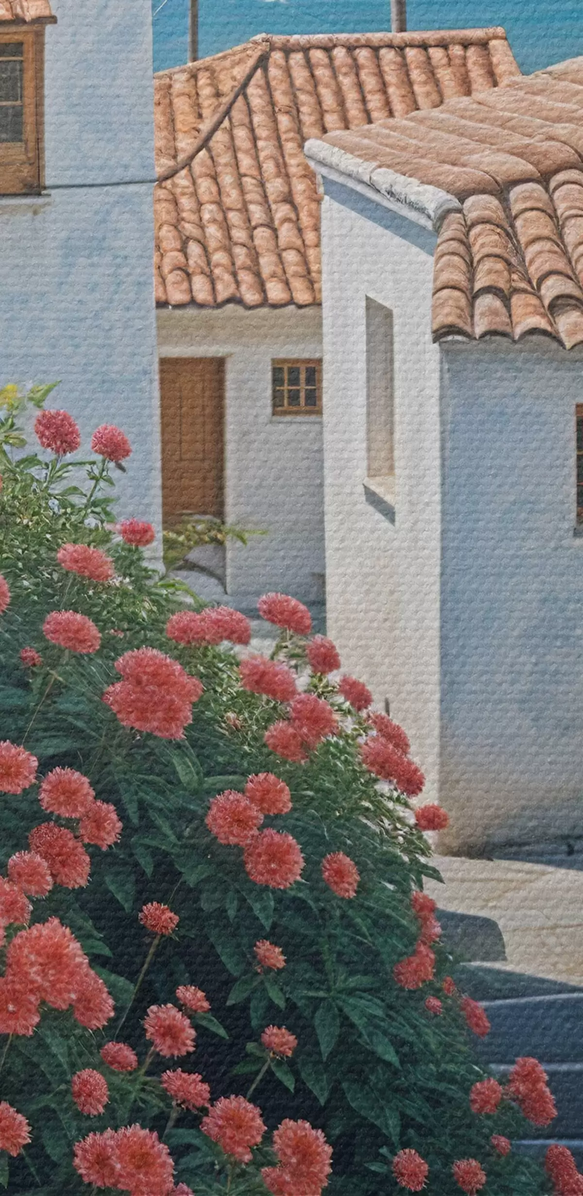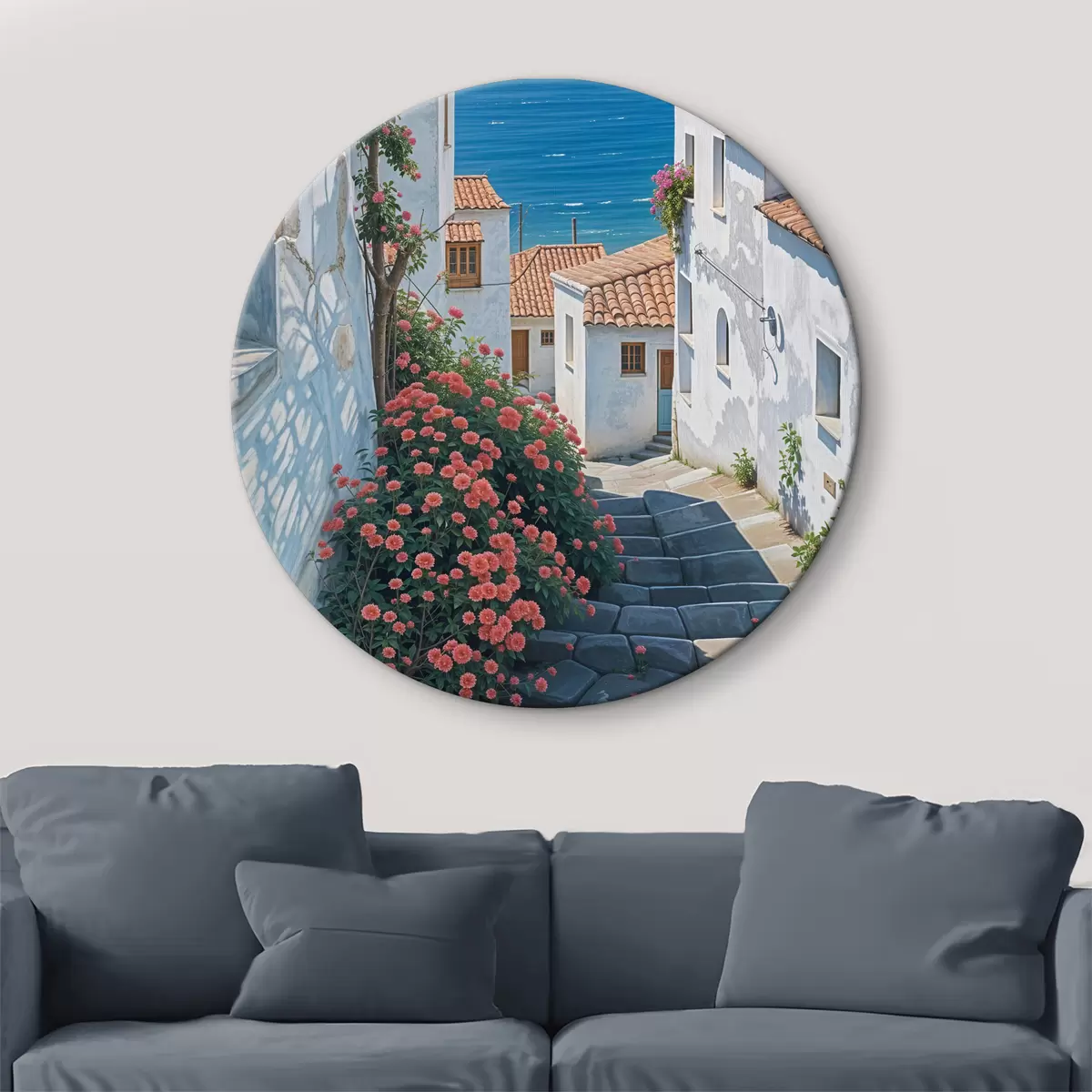Obrázok Úzka ulička v pobrežnom meste s bielymi budovami, červenými škridlovými strechami a žiarivými ružovými kvetmi Nr r39532