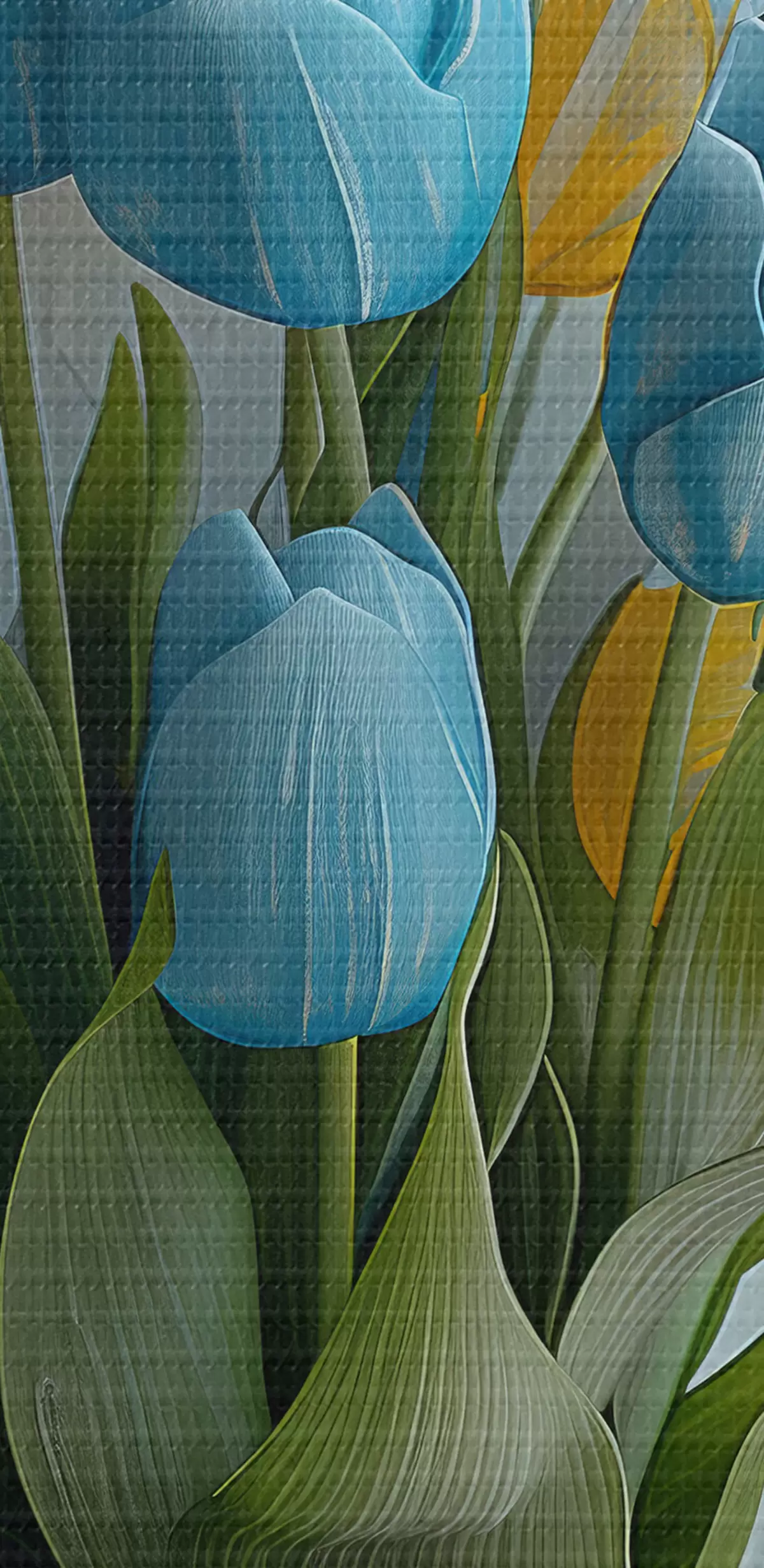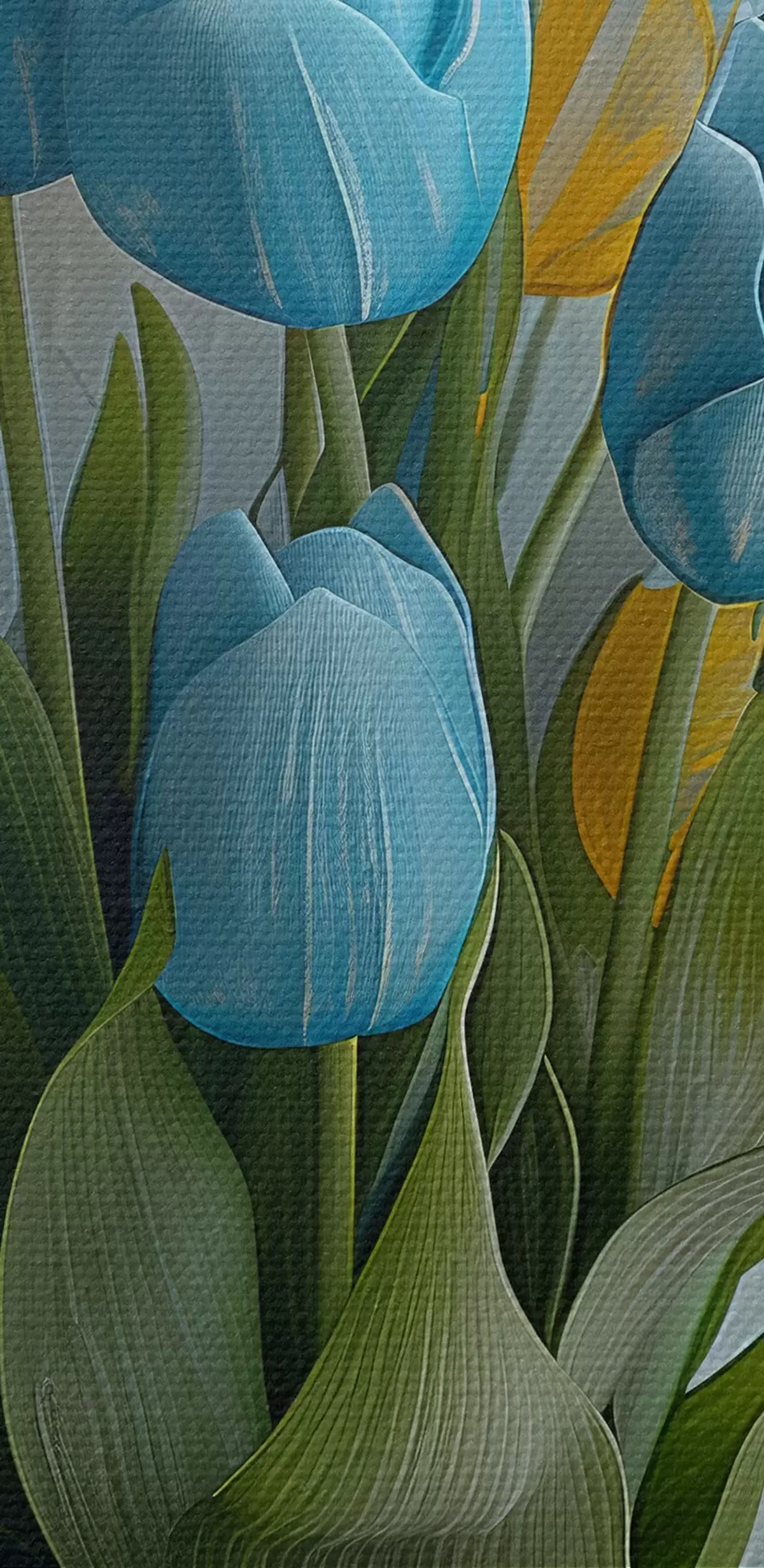 Obrázok Modré a žlté tulipány v 3D: elegantný nástenný obraz s bielym rámom, bielym a svetlomodrým pozadím a gravírovanou vázou Nr r39636