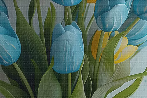 Obrázok Modré a žlté tulipány v 3D: elegantný nástenný obraz s bielym rámom, bielym a svetlomodrým pozadím a gravírovanou vázou Nr r39636