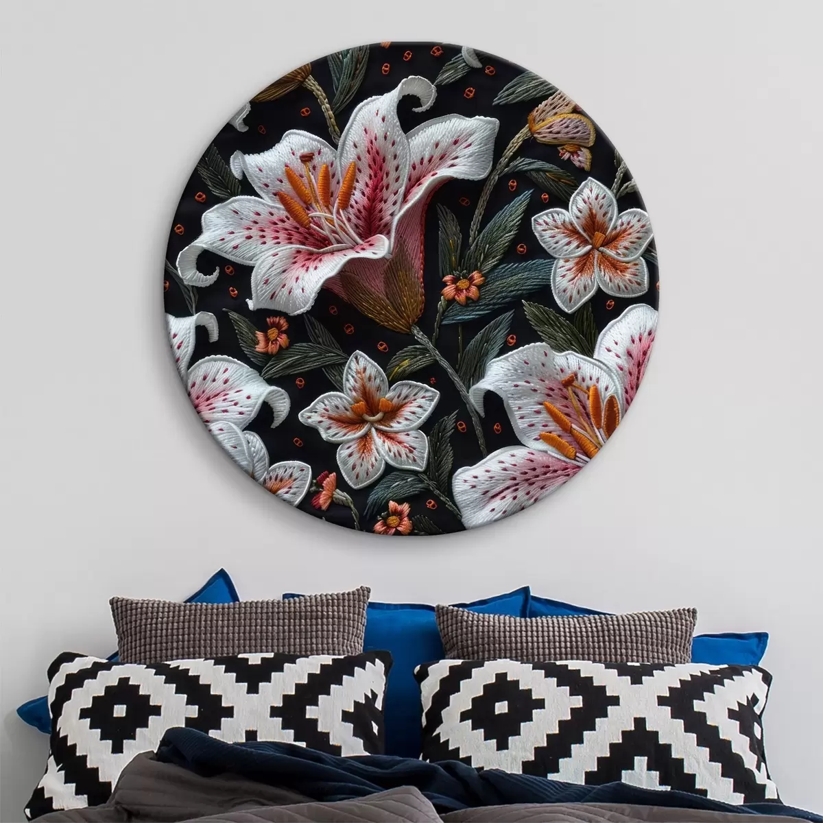 Obrázok Stumpwork výšivka: kvitnúce ľalie čiernou niťou na zdobenej látke s dvojfarebnou paletou Nr r39649