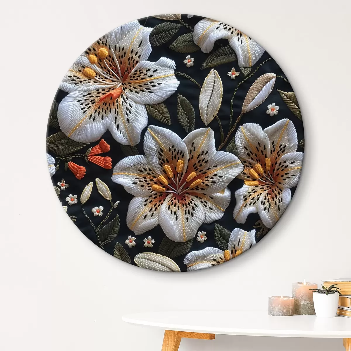 Obrázok Stumpwork výšivka: kvitnúce ľalie čiernou niťou na zdobenej látke s detailným výtvarným umením Nr r39650