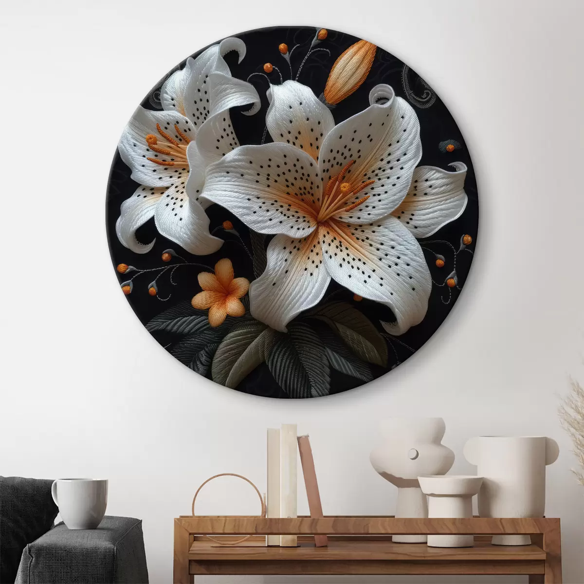 Obrázok Stumpwork výšivka: veľké ľalie čiernou niťou na zdobenej látke so zložitými detailmi Nr r39655