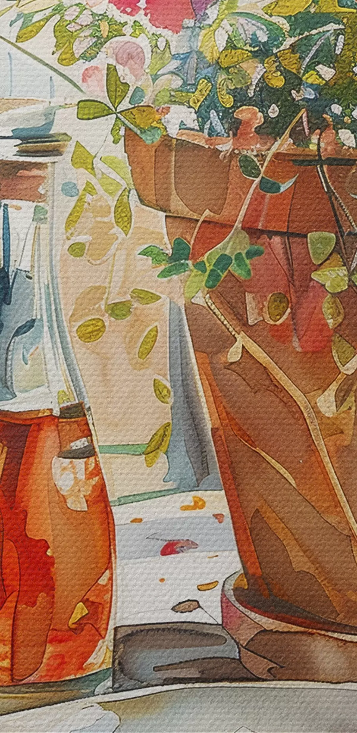 Obrázok Akvarel vetva s rizotom, slnečné svetlo v okne, pohár koktailu, kvetináč Nr r39706