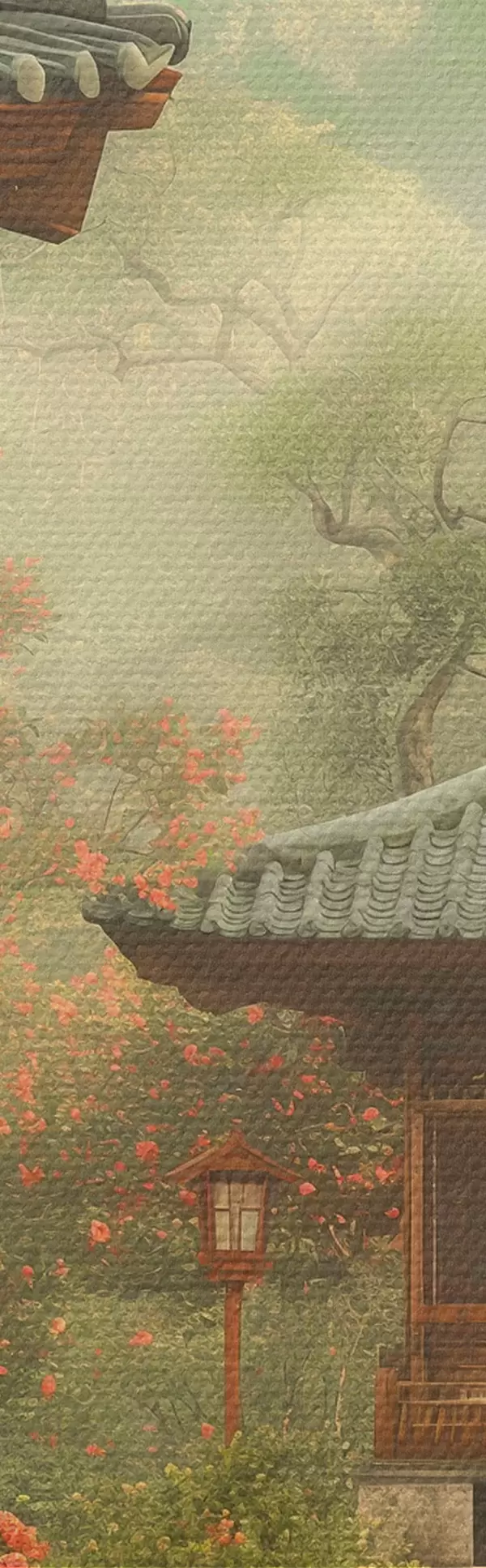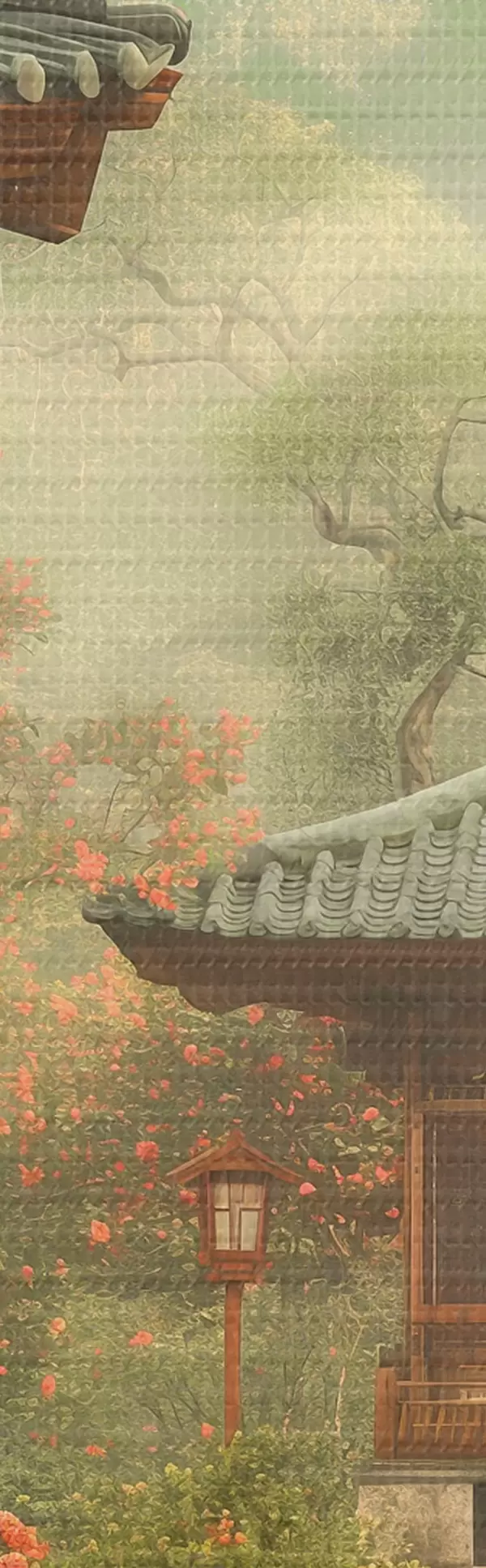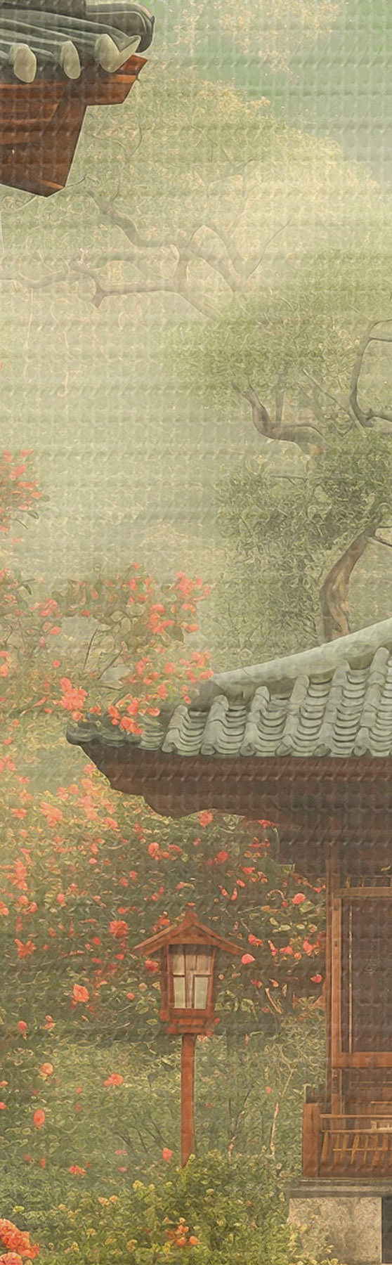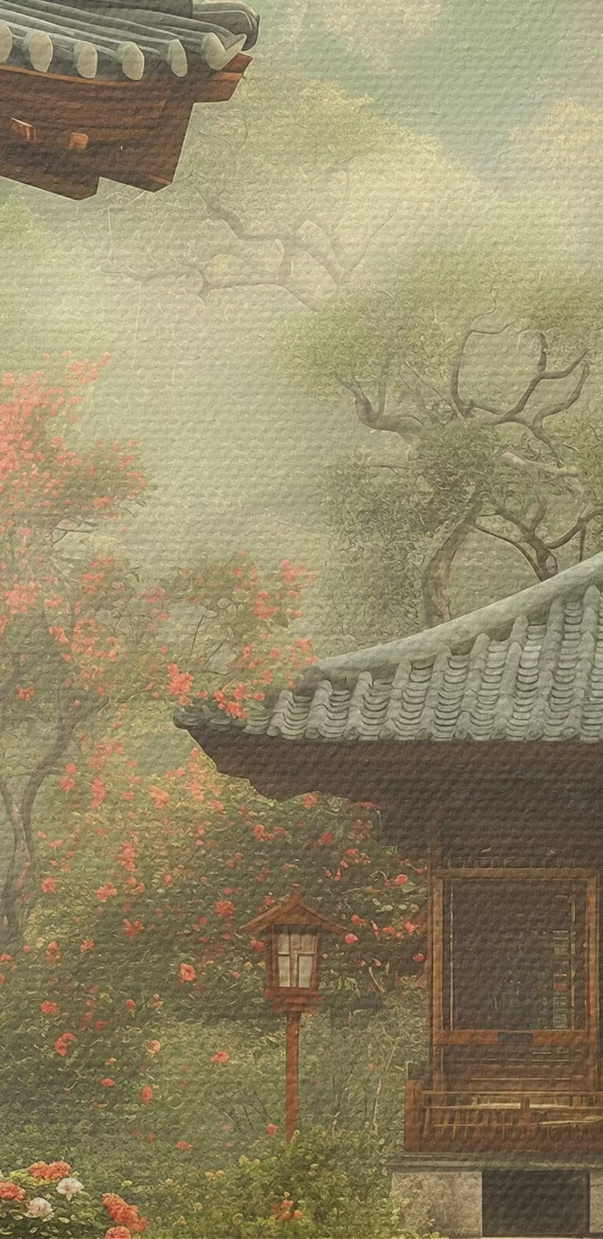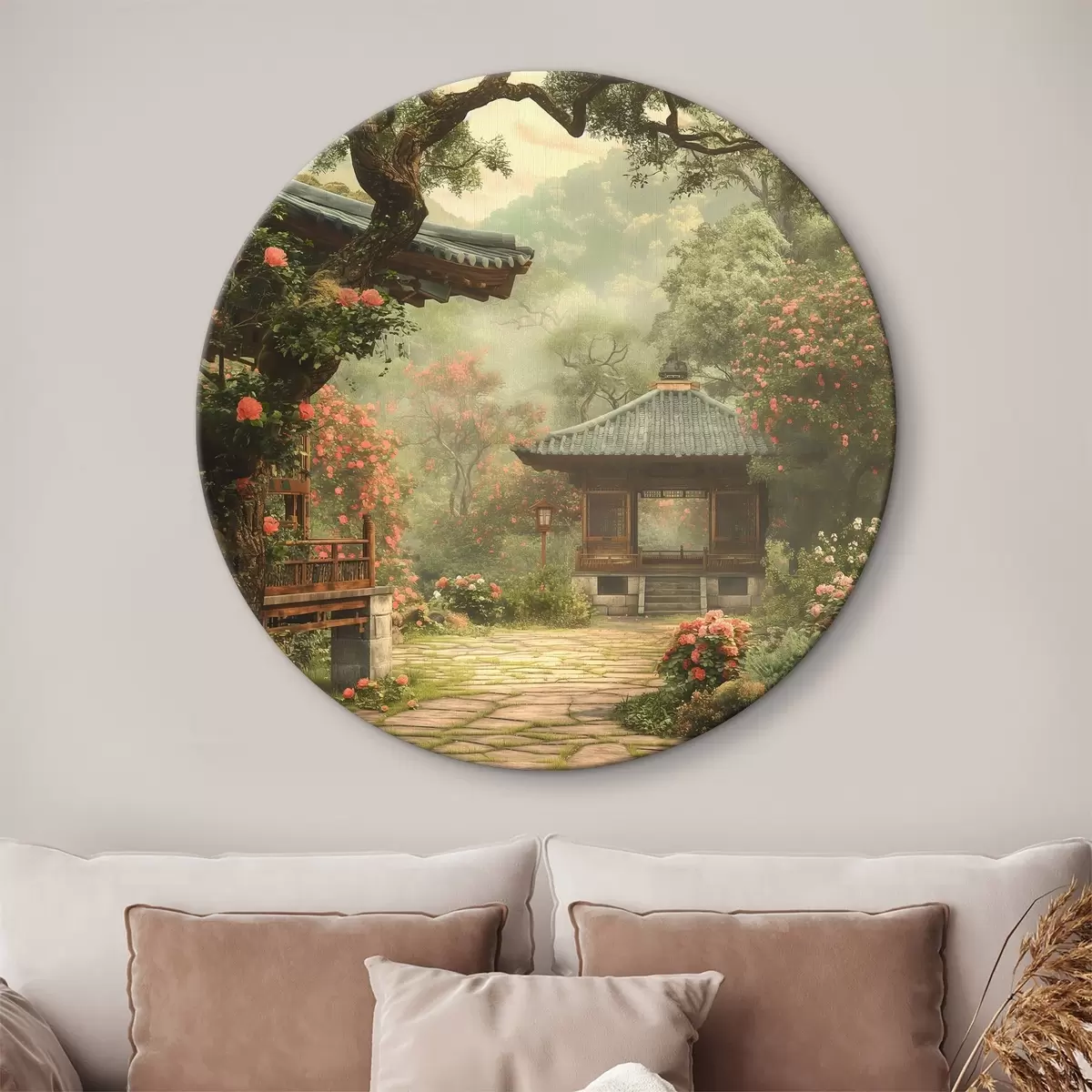 Obrázok Japonský park s rozkvitnutými stromami a kvetmi, les, drevenica Nr r39773